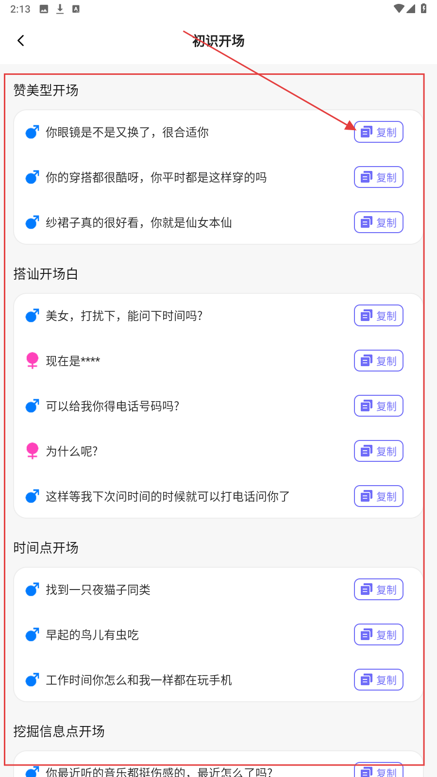 2、在【初识开场】页,选喜欢话术点【复制】,直接用于和Ta的初次交流。
