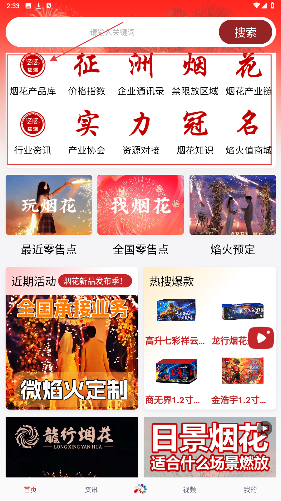 1、进入app首页,用搜索找特定烟花,或点模块查产品、资讯。