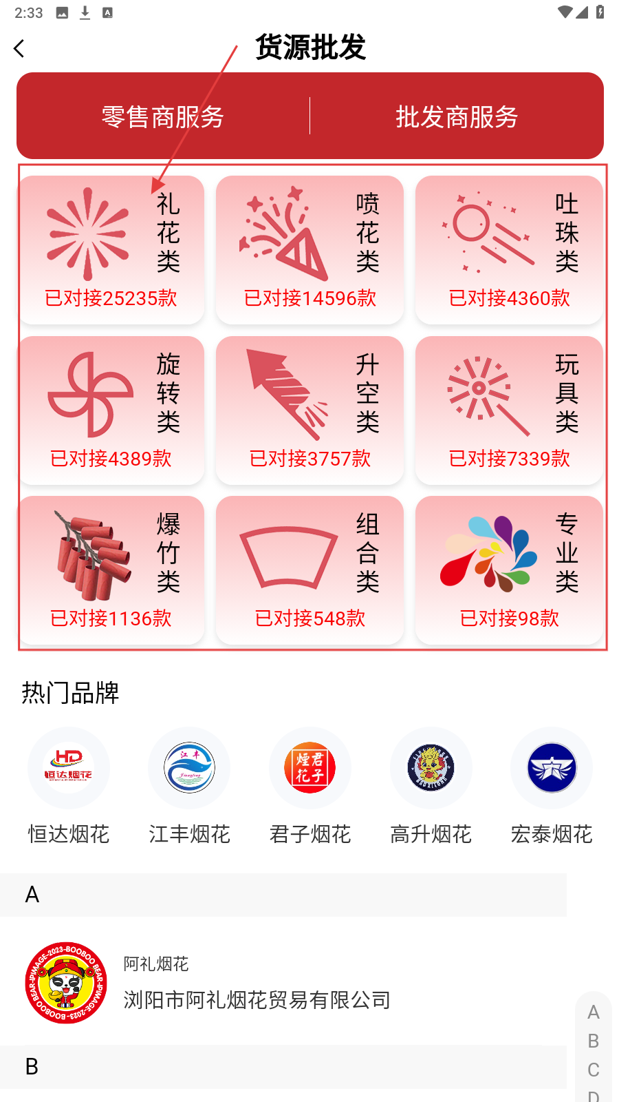2、在【货源批发】选【礼花类】,浏览已对接款式,找心仪烟花资源。