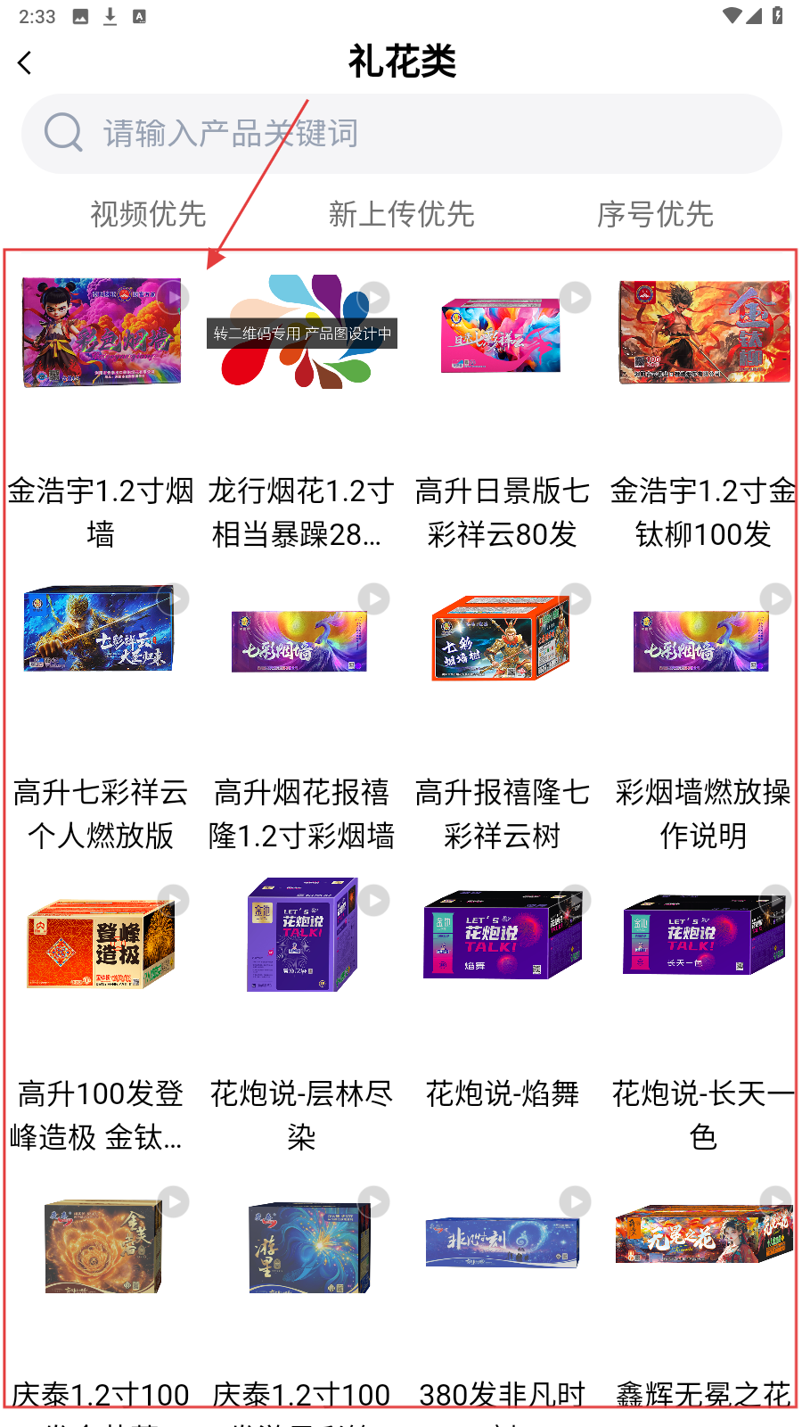 3、进入【礼花类】列表,按关键词搜产品,依据排序筛烟花款式。