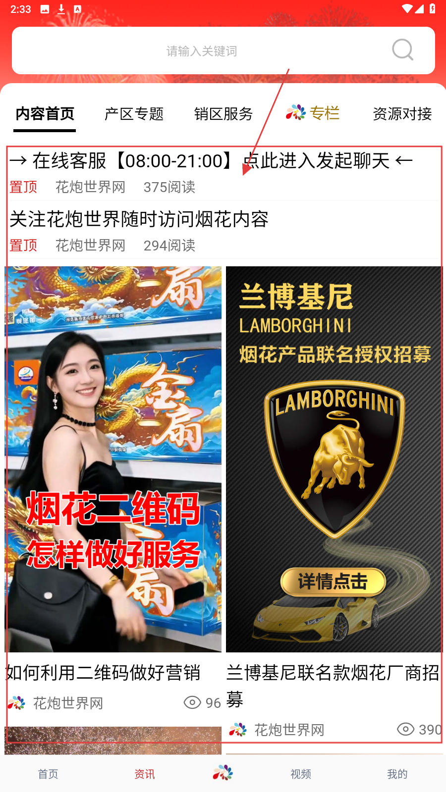 4、切换【资讯】页,关注在线客服、专题内容,了解烟花行业动态。