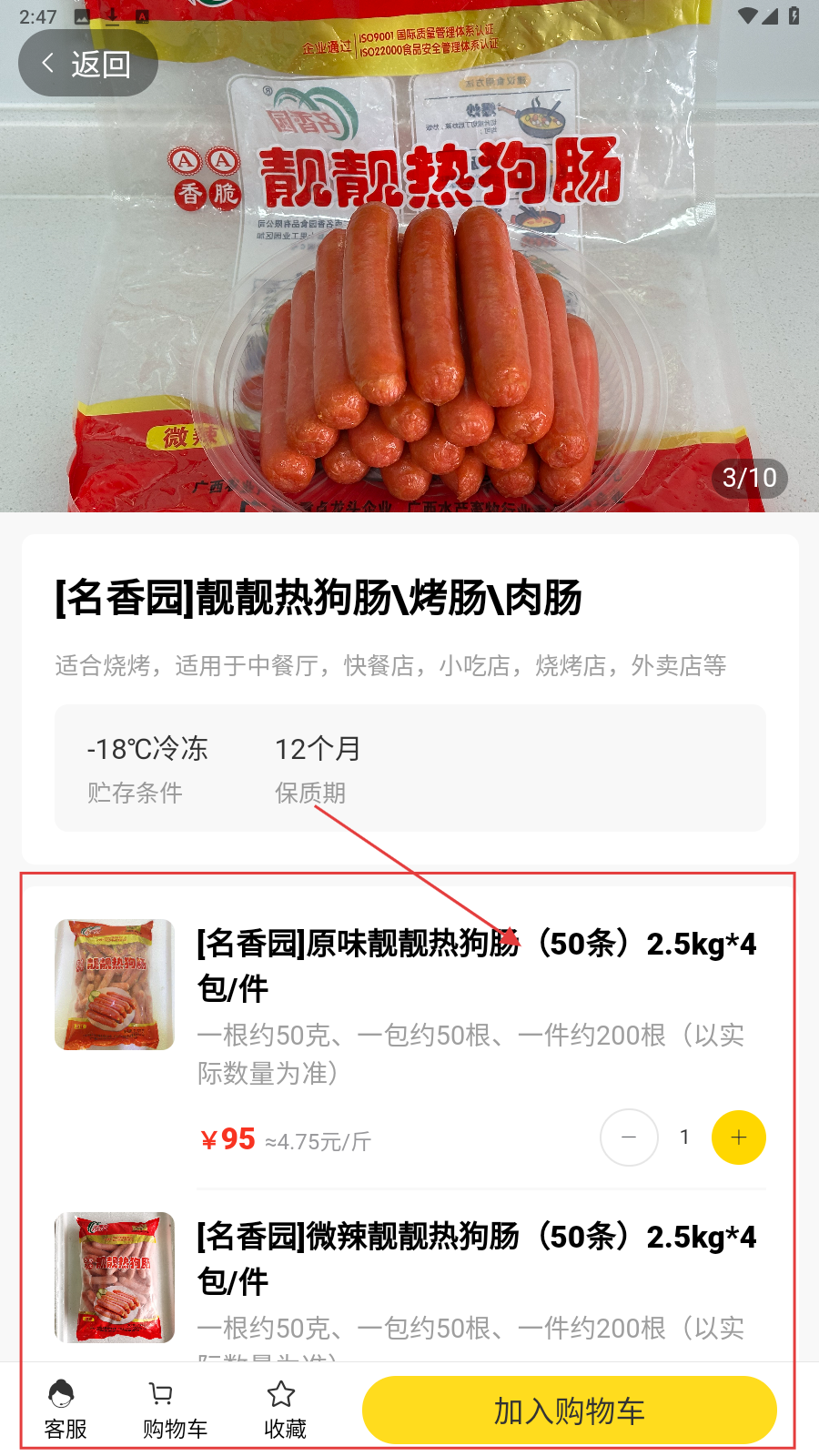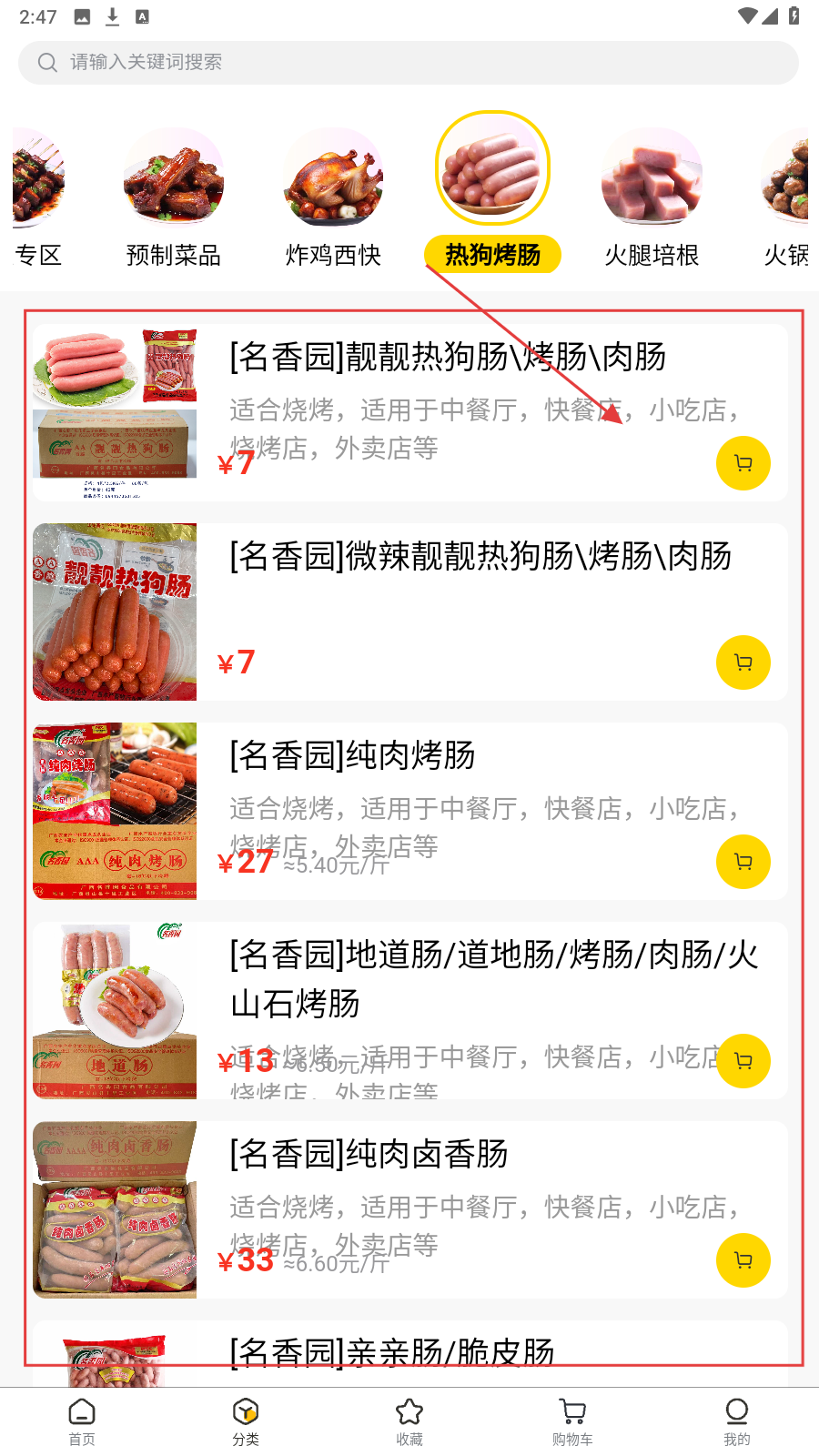 2、在商品列表页,点感兴趣的【名香园】热狗肠,查看详情与价格。