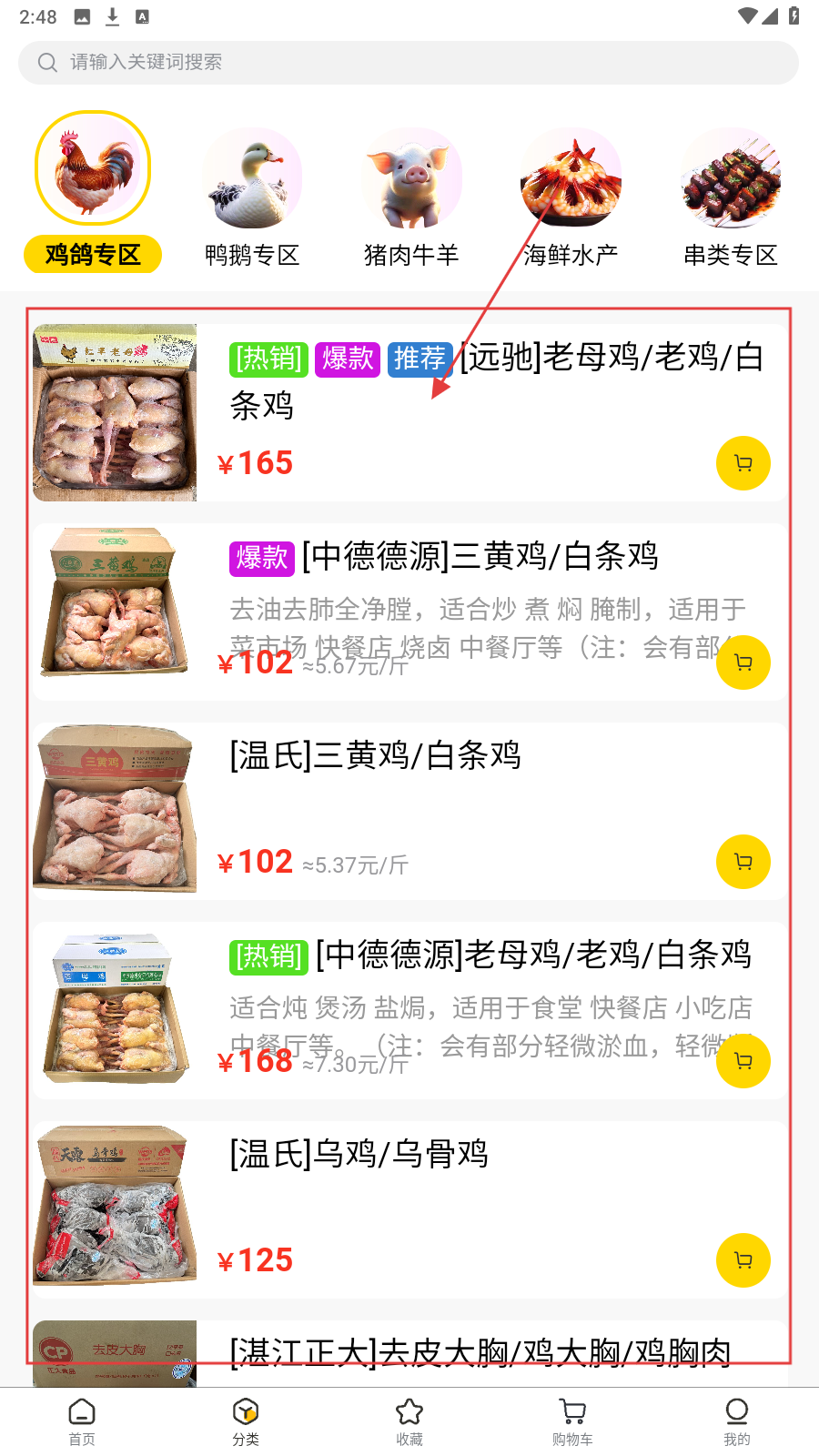 4、切换【鸡鸽专区】,浏览远驰老母鸡等产品,按需挑选采购。