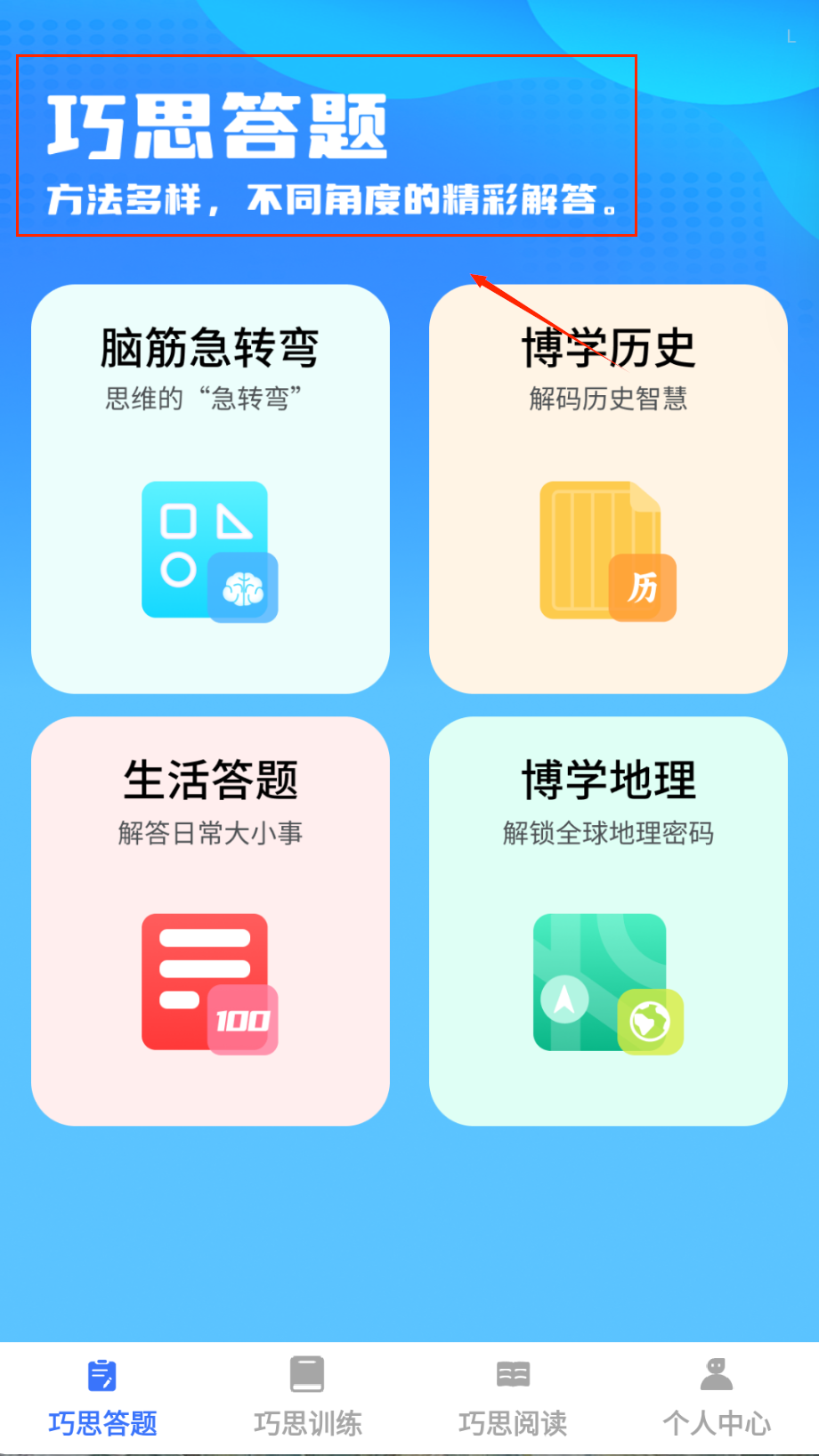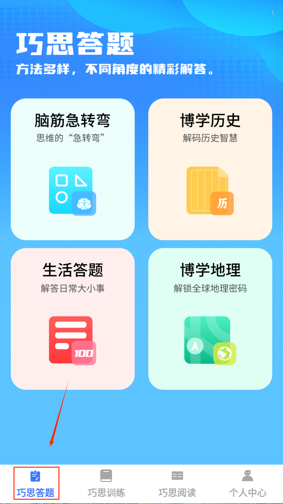 1、打开应用后进入主界面,可以看到不同类型的答题挑战板块,选择感兴趣的内容点击即可开始挑战。