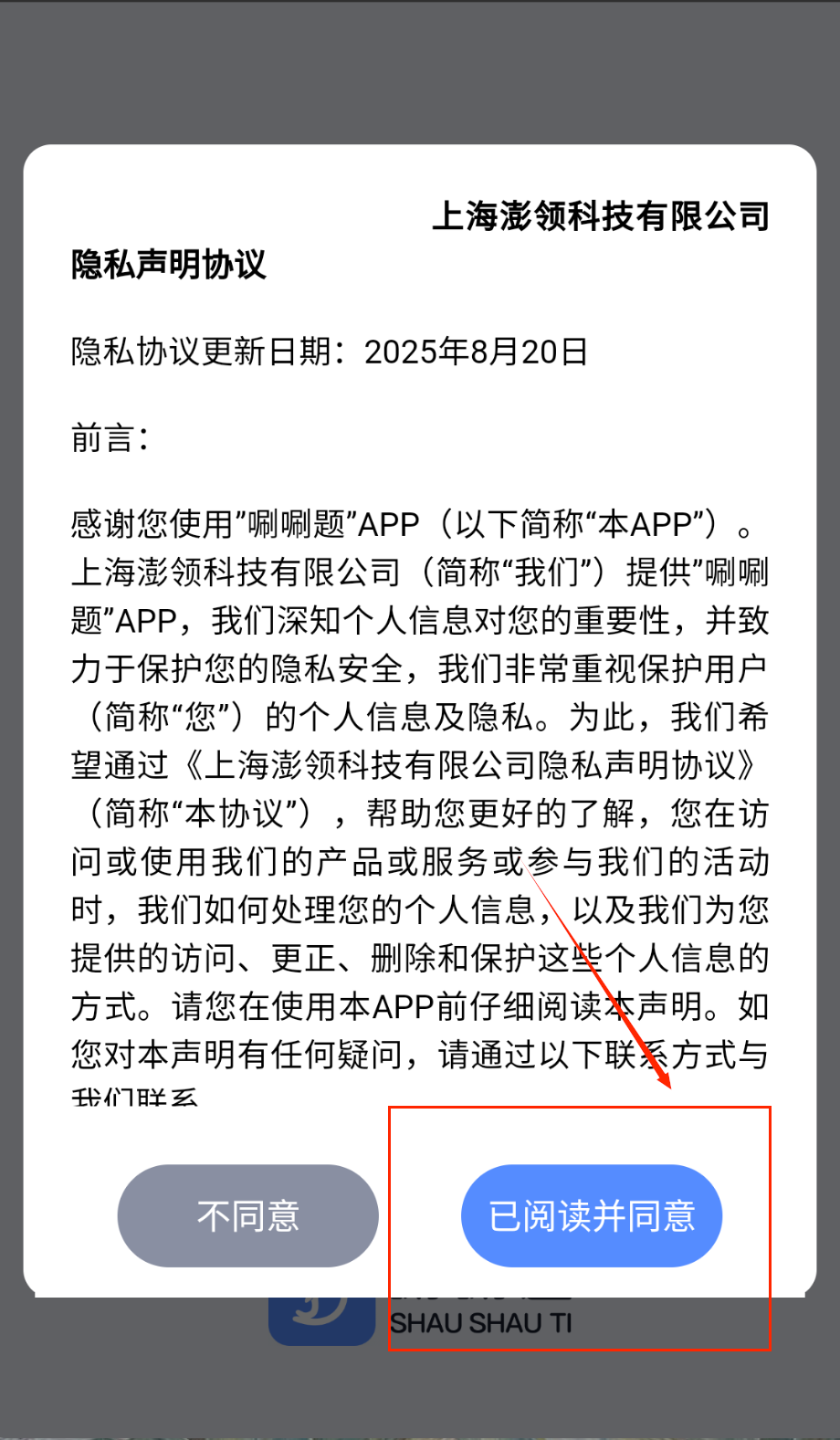 1、首次打开软件会弹出隐私声明窗口,这是上海澎领科技2025年8月更新的协议,需要仔细阅读关于个人信息处理的内容呢。