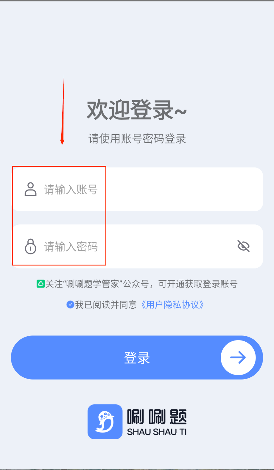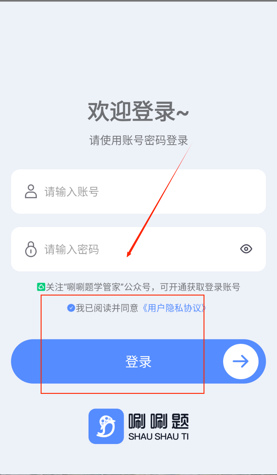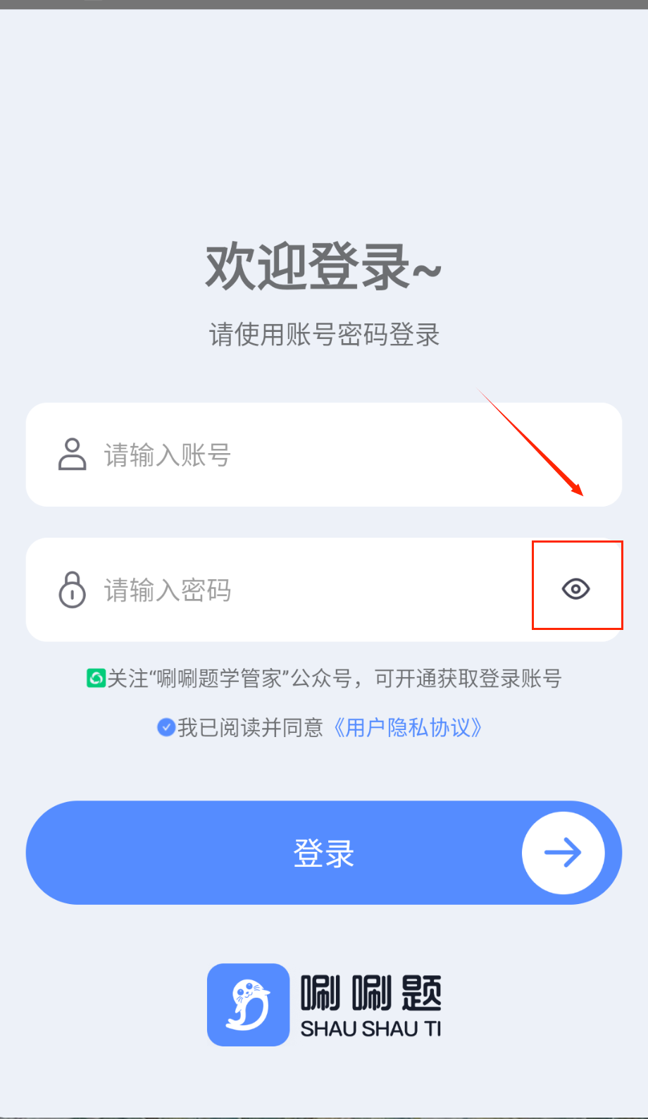 3、输入密码时要注意大小写区分,旁边那个眼睛图标可以点击查看明文确认。如果忘记密码可以尝试关注"唰题学管家"公众号找回。