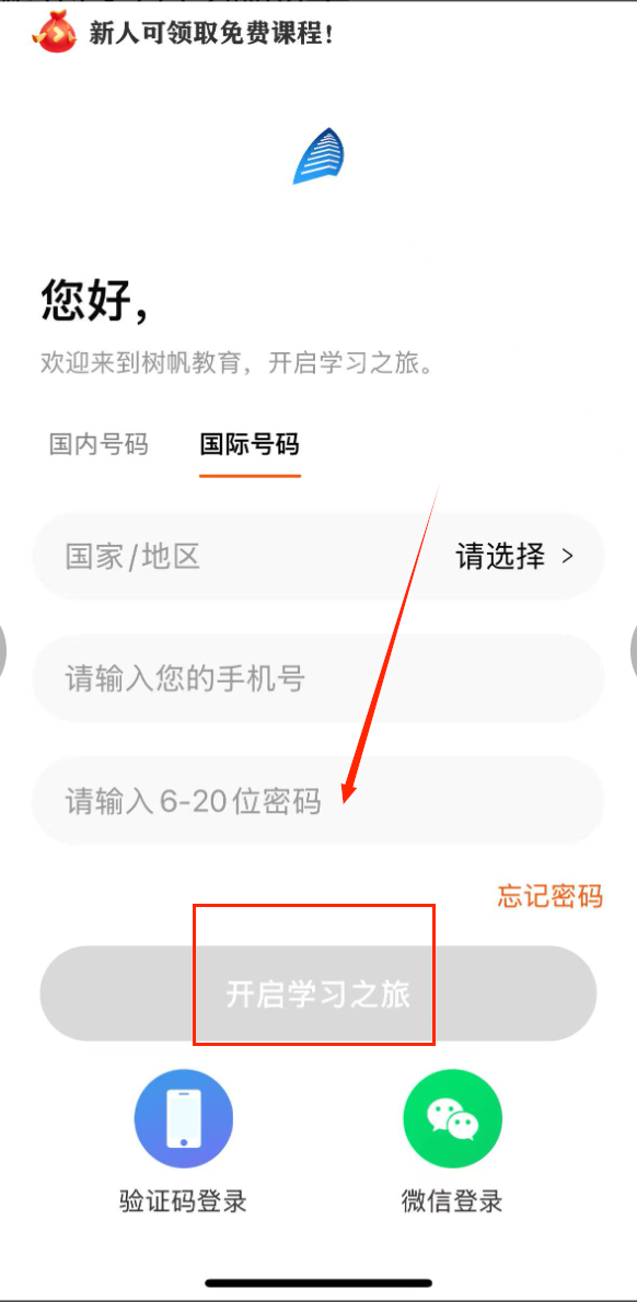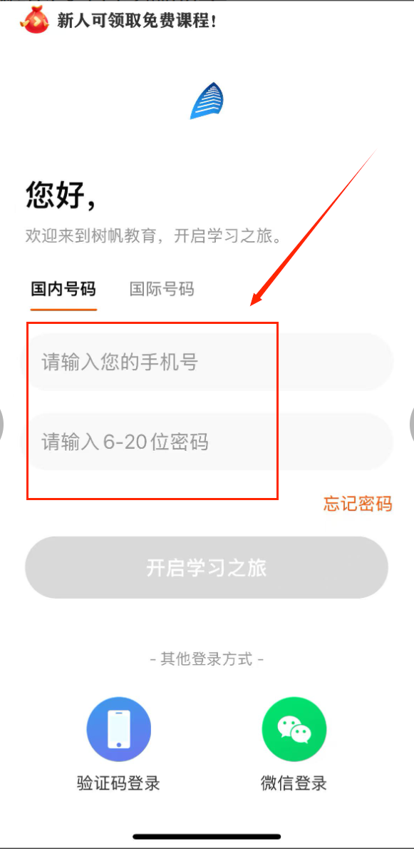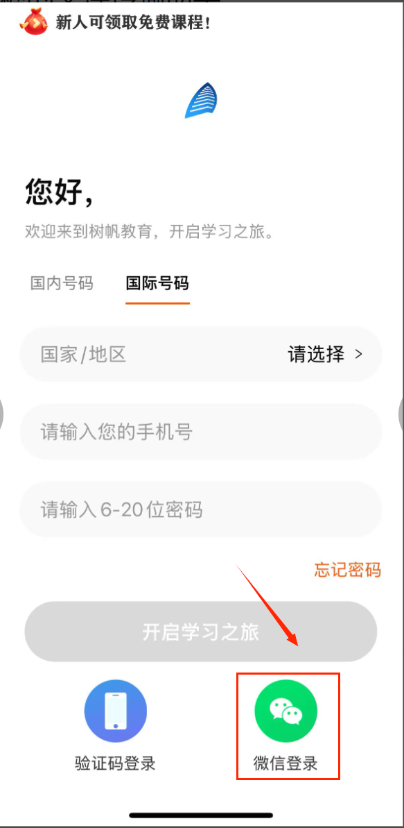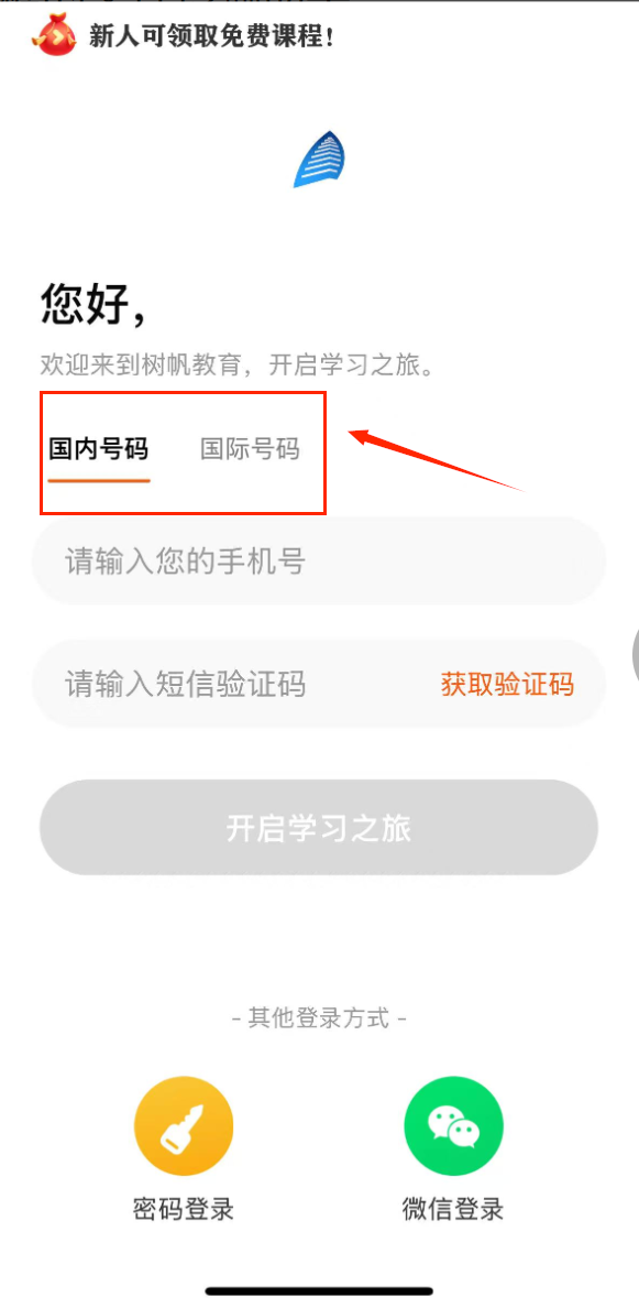 1、打开软件首先会看到欢迎界面,顶部有新人免费课程的提示呢。中间是树帆教育的标志和欢迎语,下方有国内和国际号码选项。