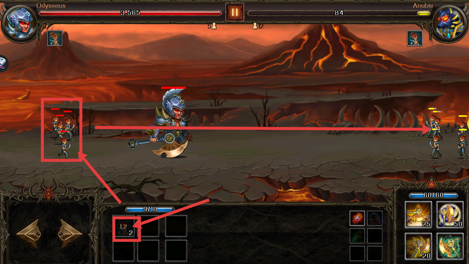 2、战斗中用方向键移动【Odysseus】,召唤兵种并搭配右侧装备,精准攻击【Anubis】及其部队。