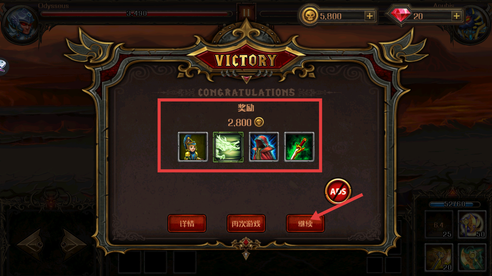 4、胜利后领取【2800】金币与道具,点击【继续】推进关卡,积累资源提升英雄实力。
