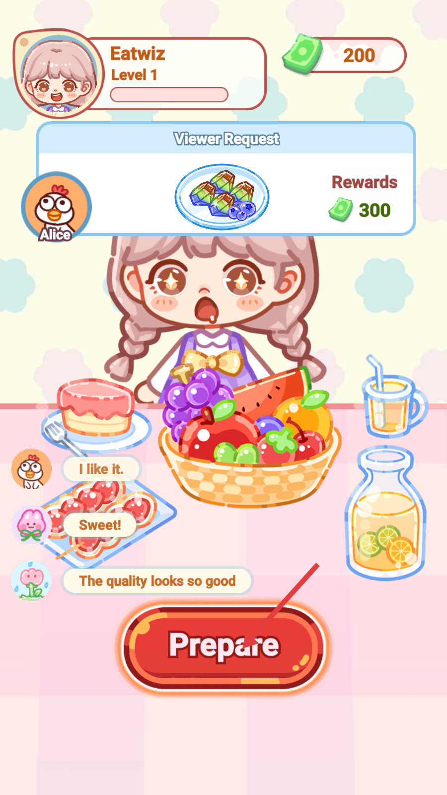 1、角色【Eatwiz-Level-1】接收【Viewer-Request】,点击【Prepare】开启美食制作,规划食材搭配。