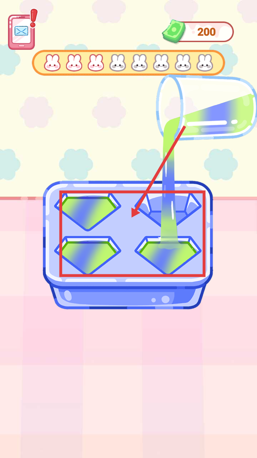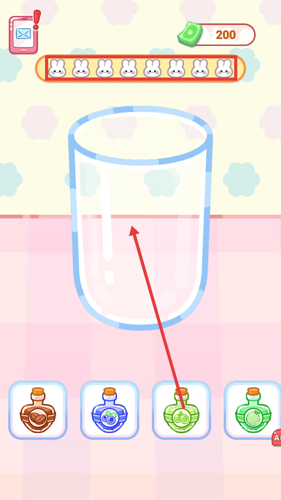 2、制作饮品时选对应原料(如绿色瓶液)倒入杯子,填充至合适位置,推进【兔子进度条】。
