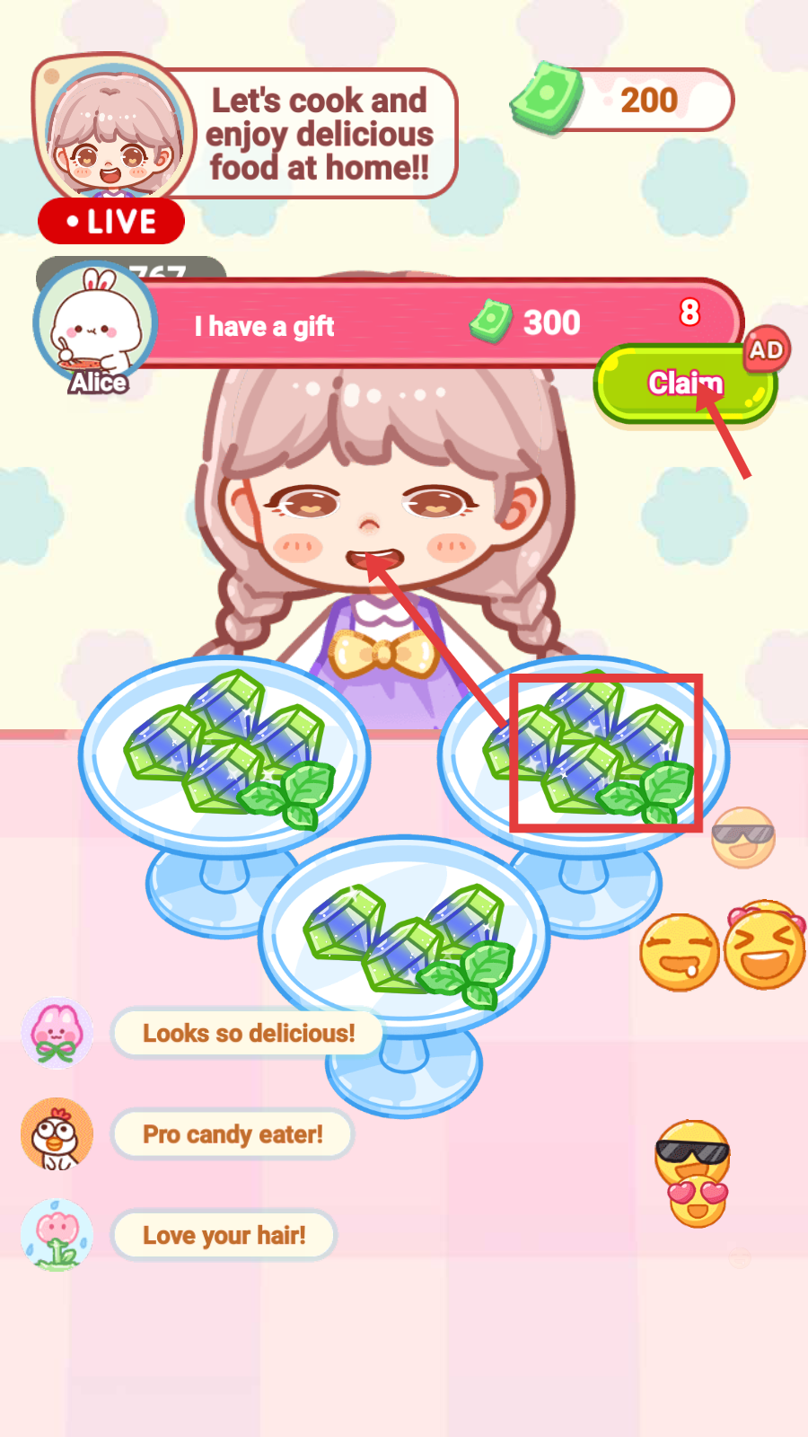 4、提交成品后,点击【Claim】领取【300】奖励,查看【Alice】等观众评价,积累好评。