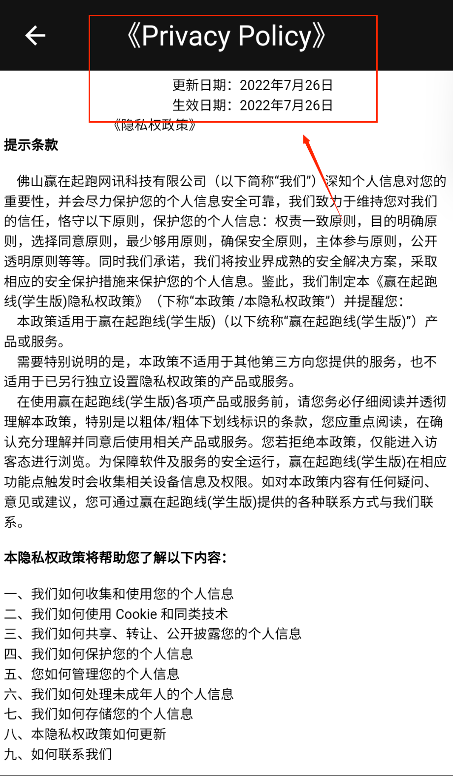 1、打开软件后首先会看到隐私政策页面,重点阅读2022年7月26日更新的条款内容,了解个人信息保护原则和使用范围。