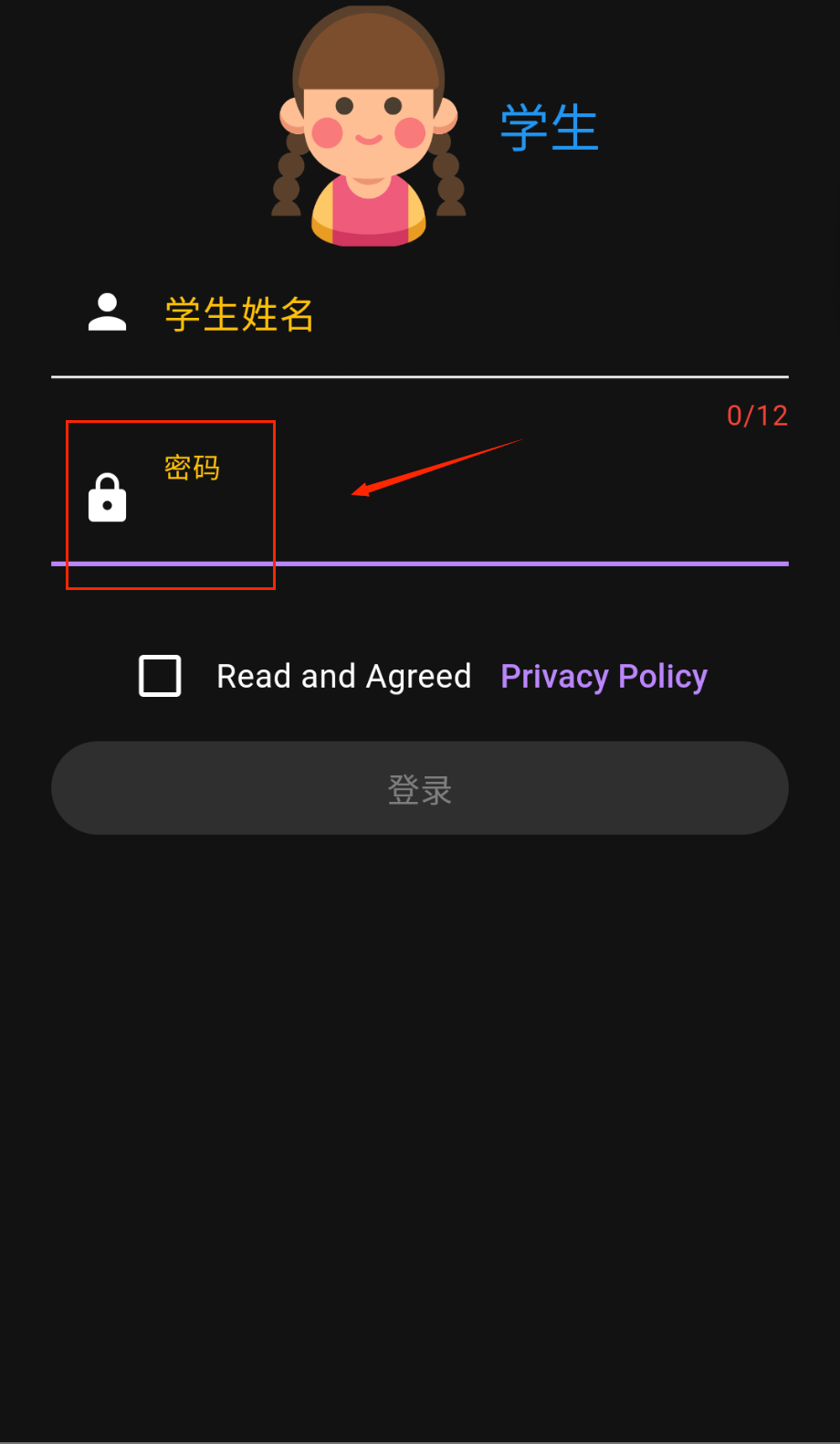 2、登录界面是黑色背景配着可爱的双马尾女孩头像,在学生姓名输入框里填写你的姓名,注意右边有0/12的字符数提示,别超过字数限制哦。
