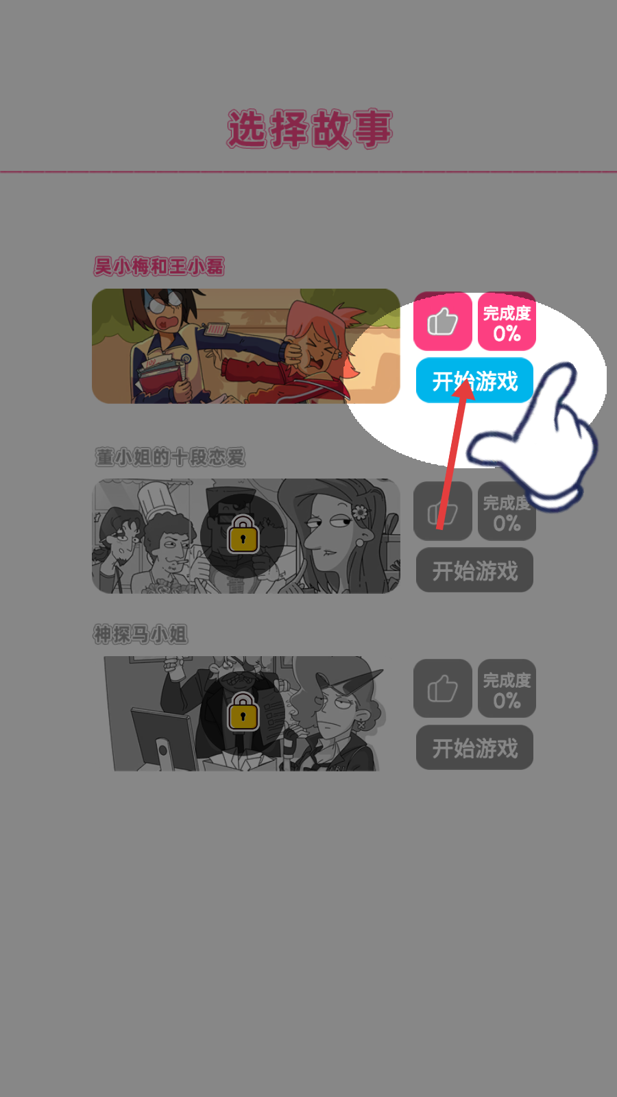 1、选择【吴小梅和王小磊】故事,点击【开始游戏】,开启郊外别墅打斗剧情的解谜之旅。