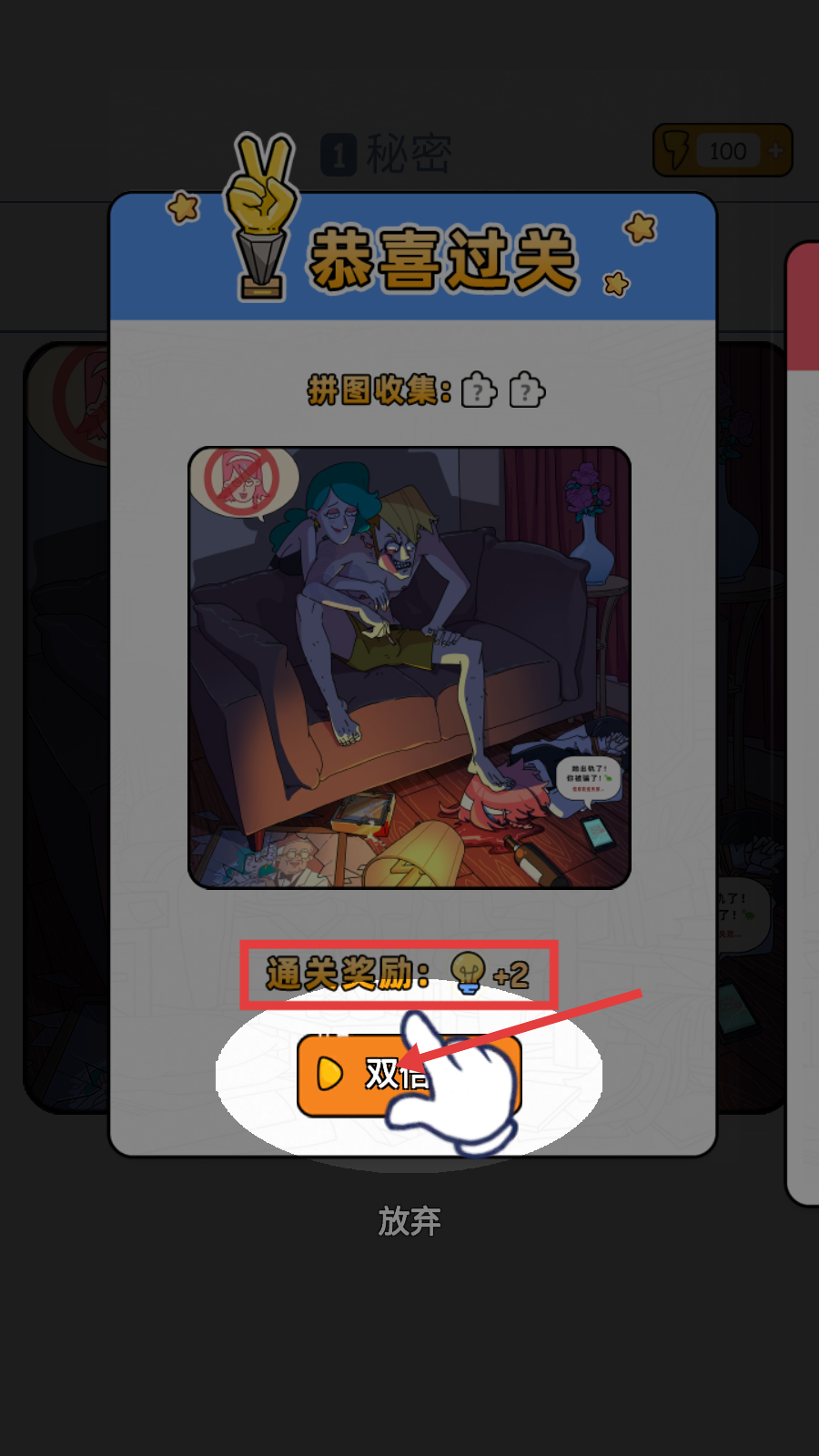4、通关后领取【通关奖励-(灯泡)+2】,点击双倍按钮加倍获取,积累道具助力后续剧情解谜。