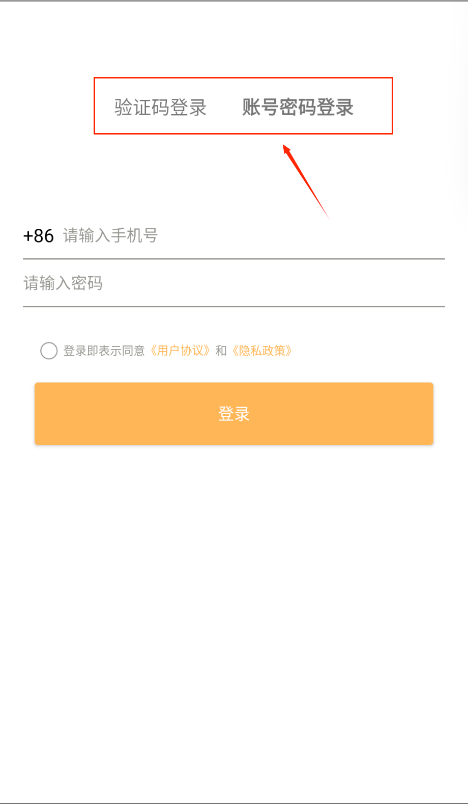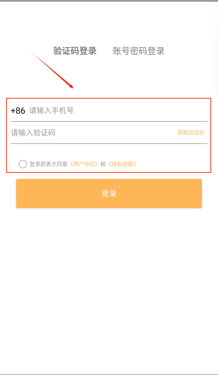 1、打开软件后你会看到登录界面,最上方显示着两种登录方式,验证码登录是默认选项,需要切换的话可以点击旁边的账号密码登录选项呢。