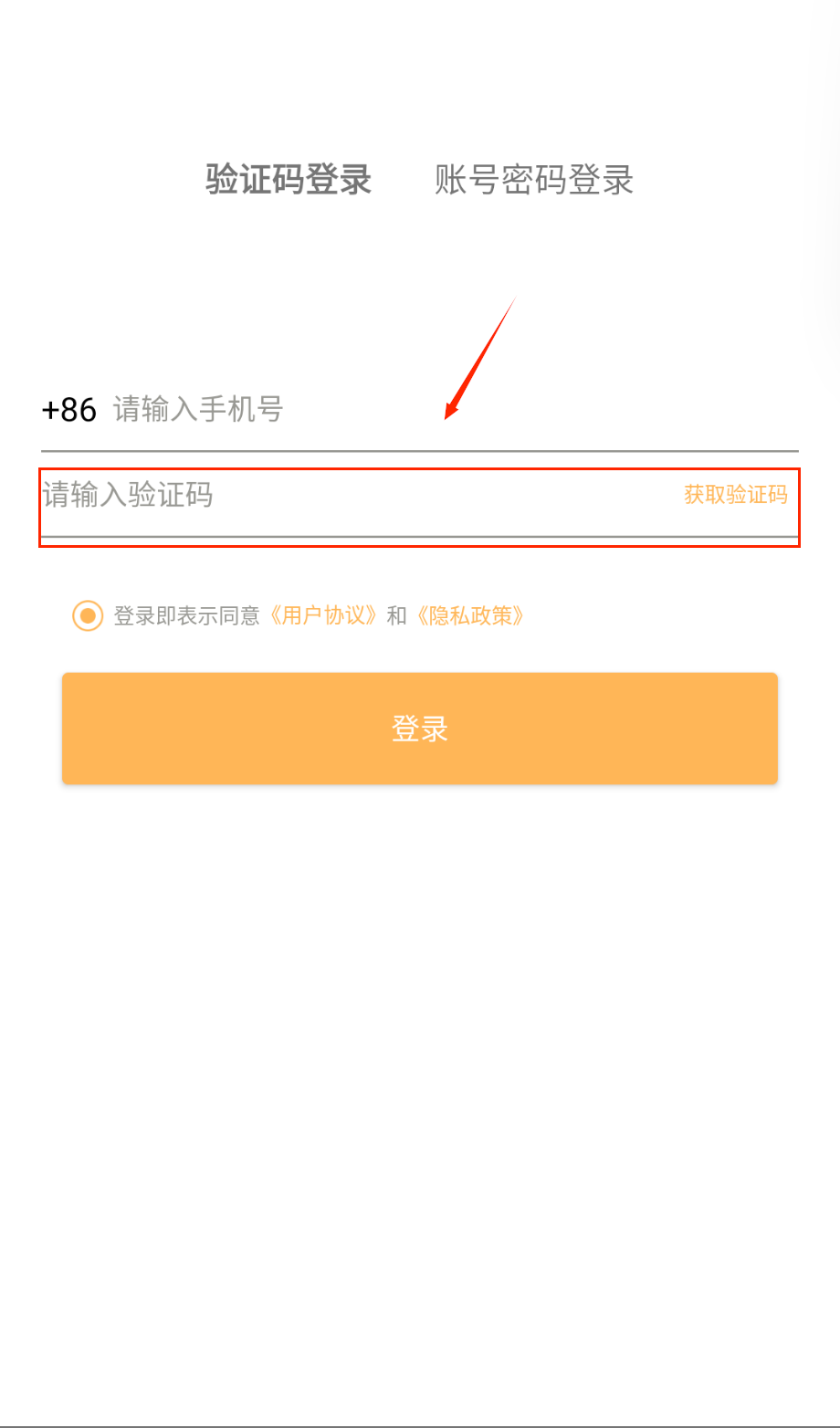 2、如果选择验证码登录方式,先在手机号输入框里输入你的手机号码,注意前面已经默认有+86的国家区号了。