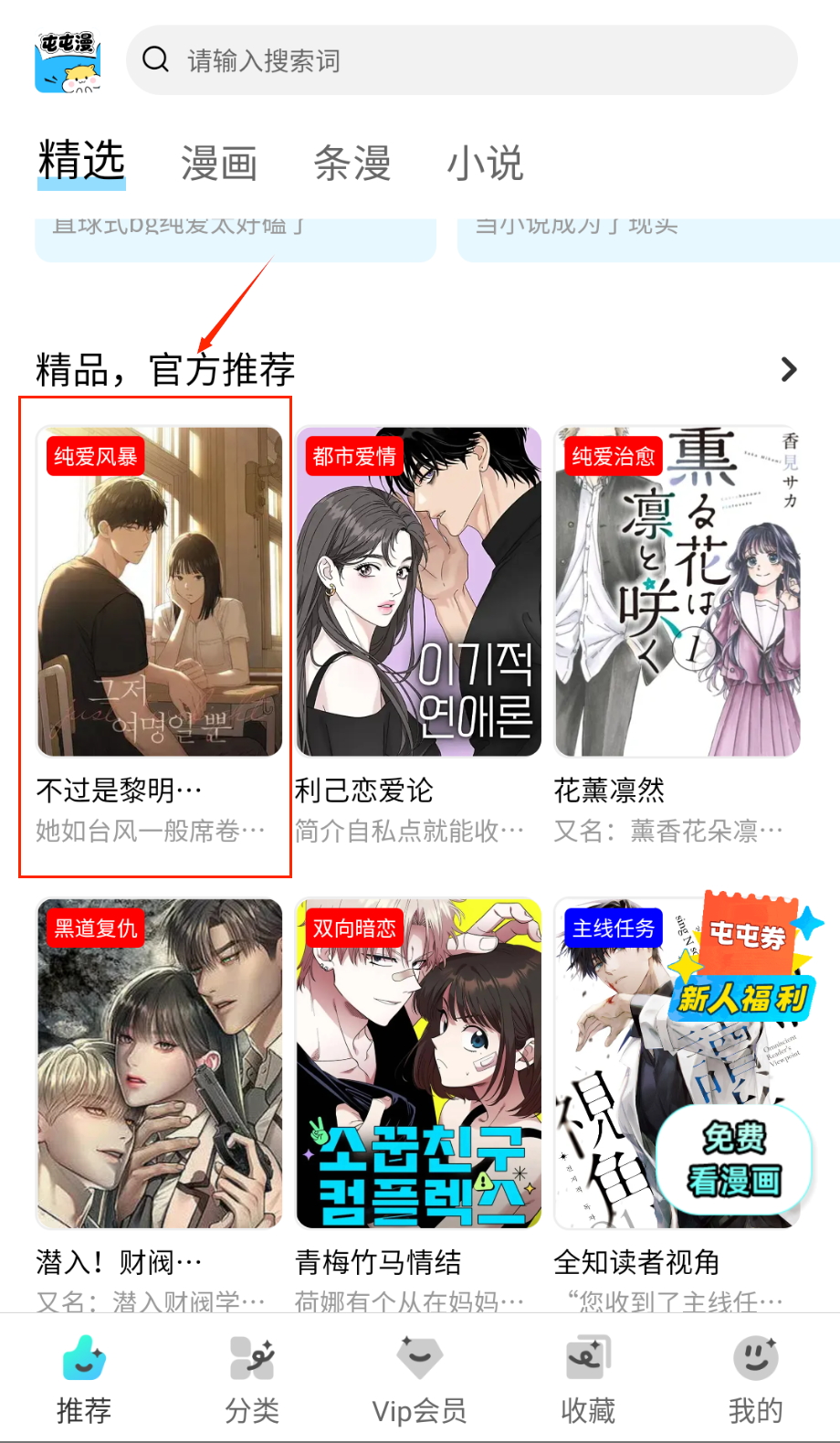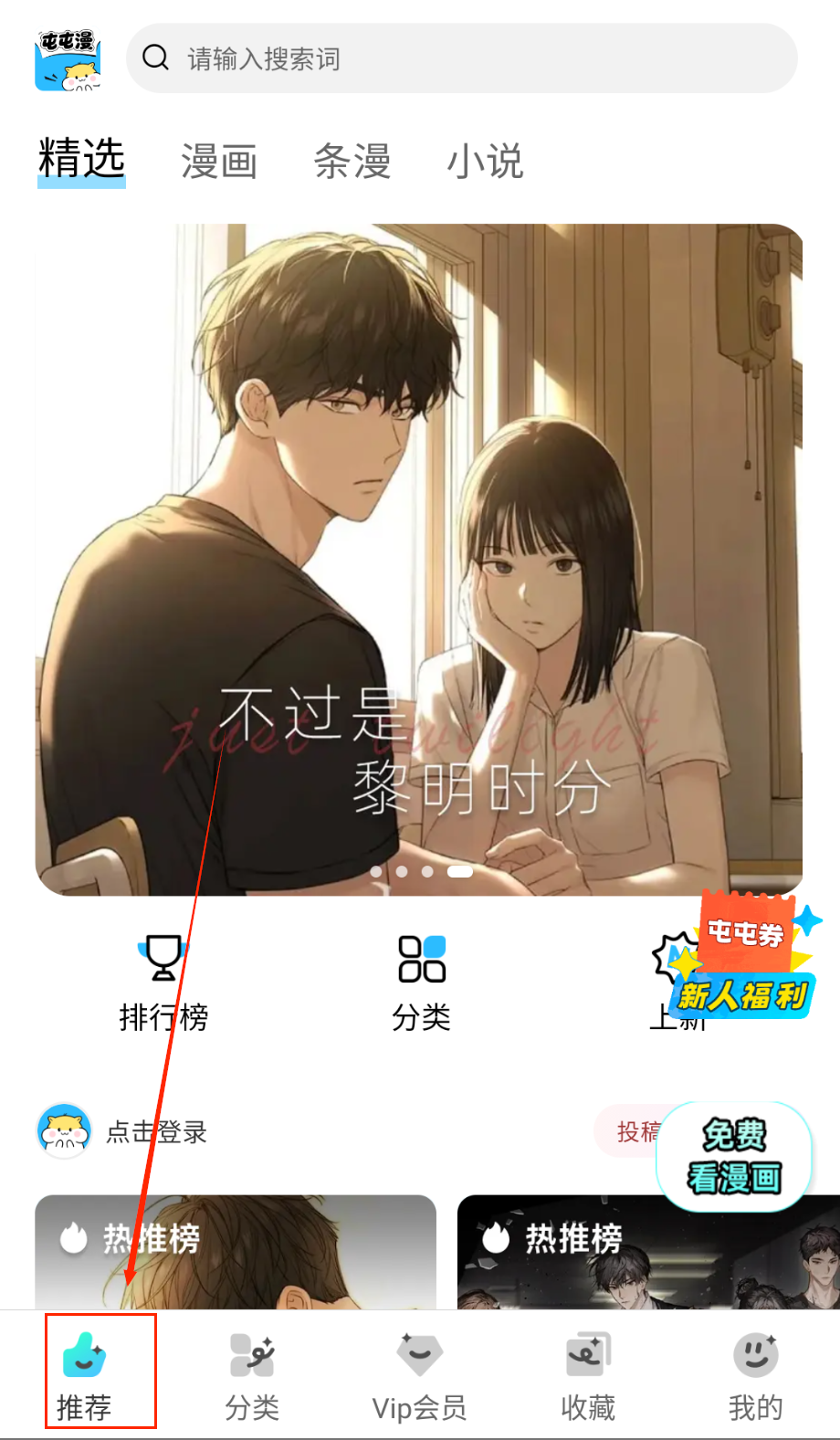 1、在屯屯漫的推荐页,点感兴趣的漫画封面能进入详情页,后续可收藏或阅读该漫画内容啦。
