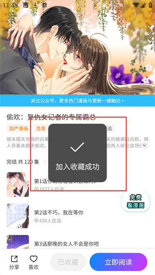 3、点收藏后会弹出“加入收藏成功”的提示,说明漫画已存进书架,后续随时能找到它啦。