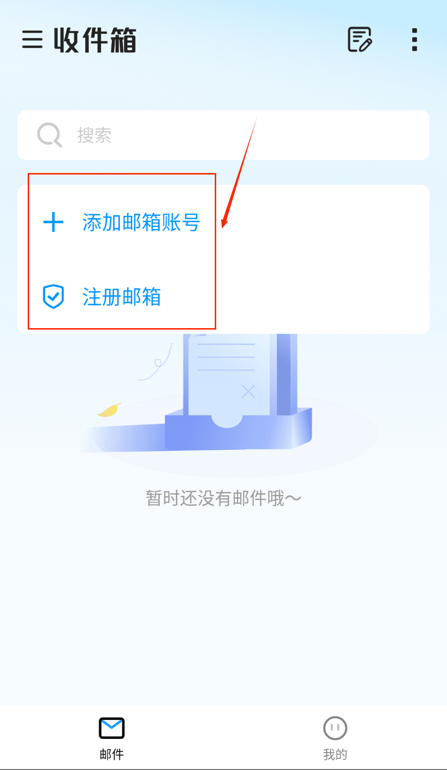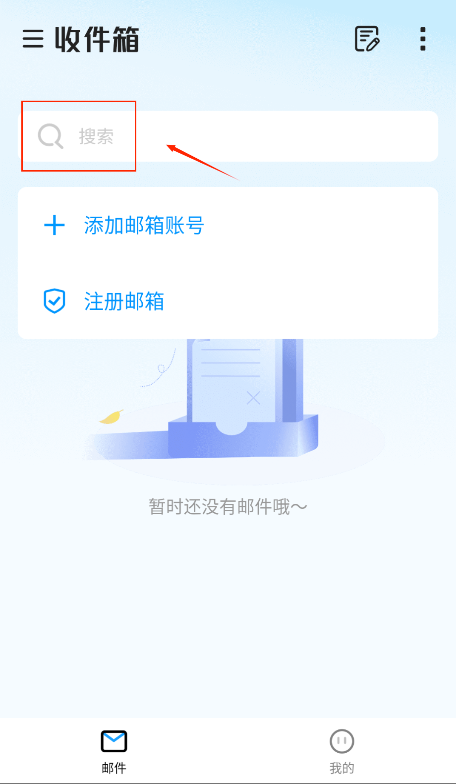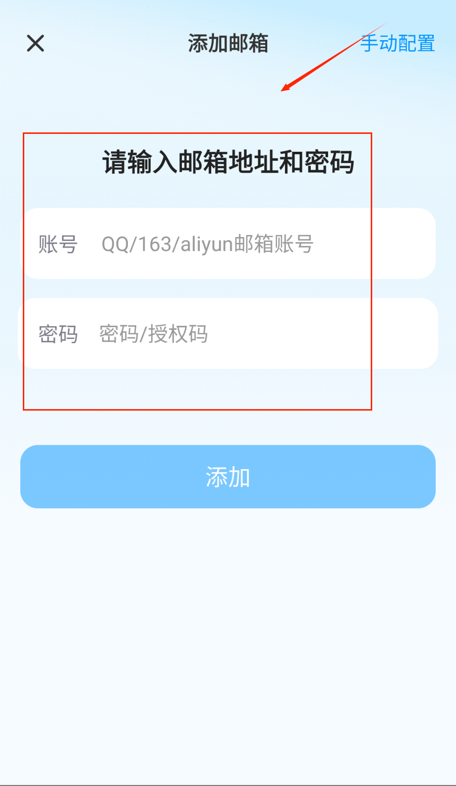 1、完成安装后首次打开应用会进入账号添加引导页,在这里输入需要绑定的邮箱地址和对应密码,系统支持主流邮箱类型的一键快速绑定呢。