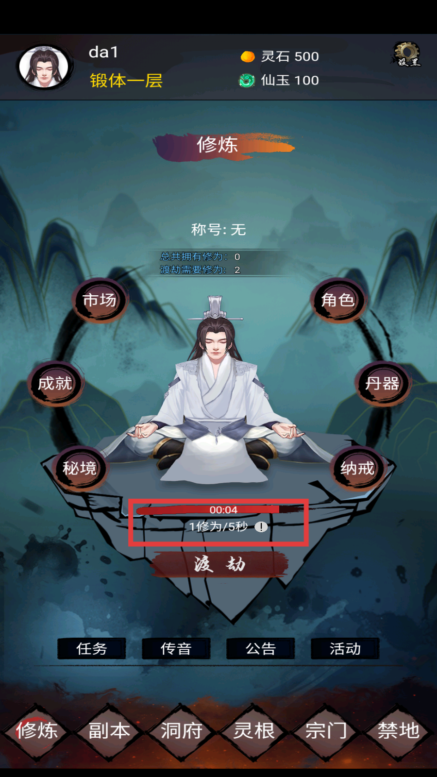 1、修炼界面先积累【1修为/5秒】,别着急渡劫,确保修为足够应对突破需求。