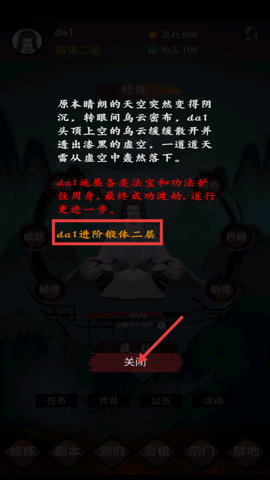 4、渡劫成功后,确认【da1进阶锻体二层】提示,点击【关闭】继续探索修炼新阶段。