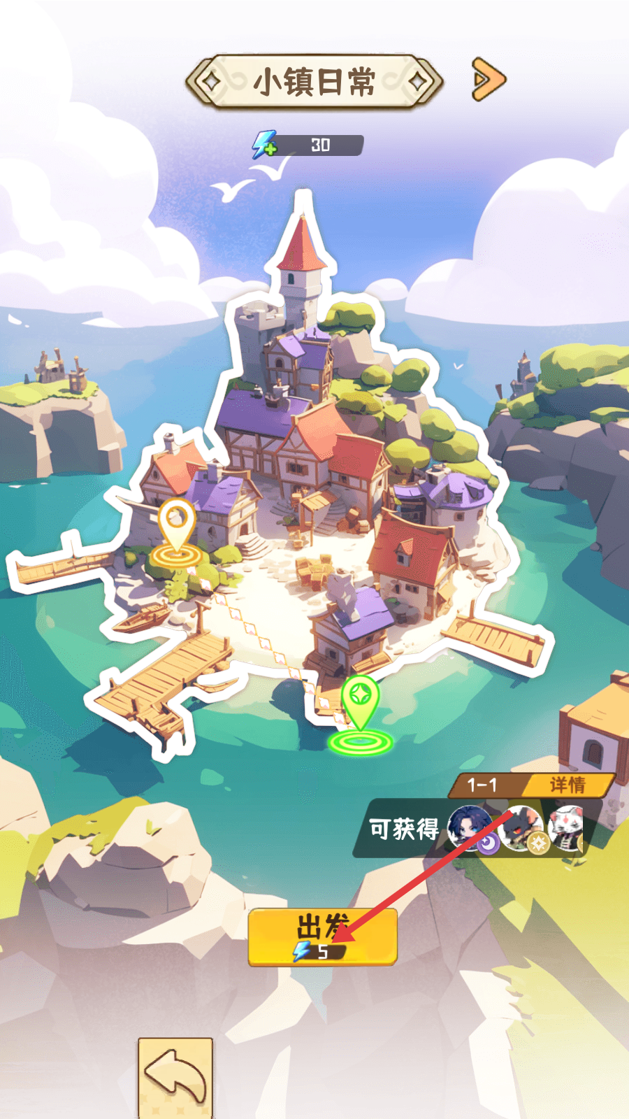 1、进入【小镇日常】界面,看到【1-1】关卡,消耗5点体力点击【出发】,即可开启冒险。