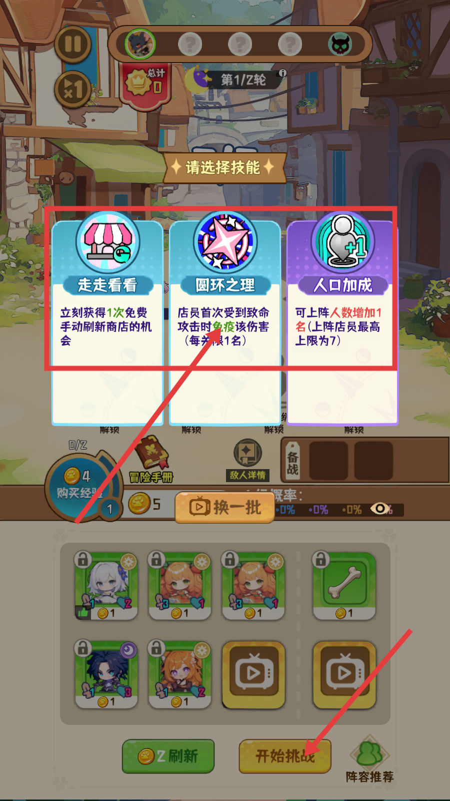 2、挑战前会出现技能选择,可根据需求选【走走看看】免费刷新商店,或【圆环之理】免伤,或【人口加成】增上阵人数。