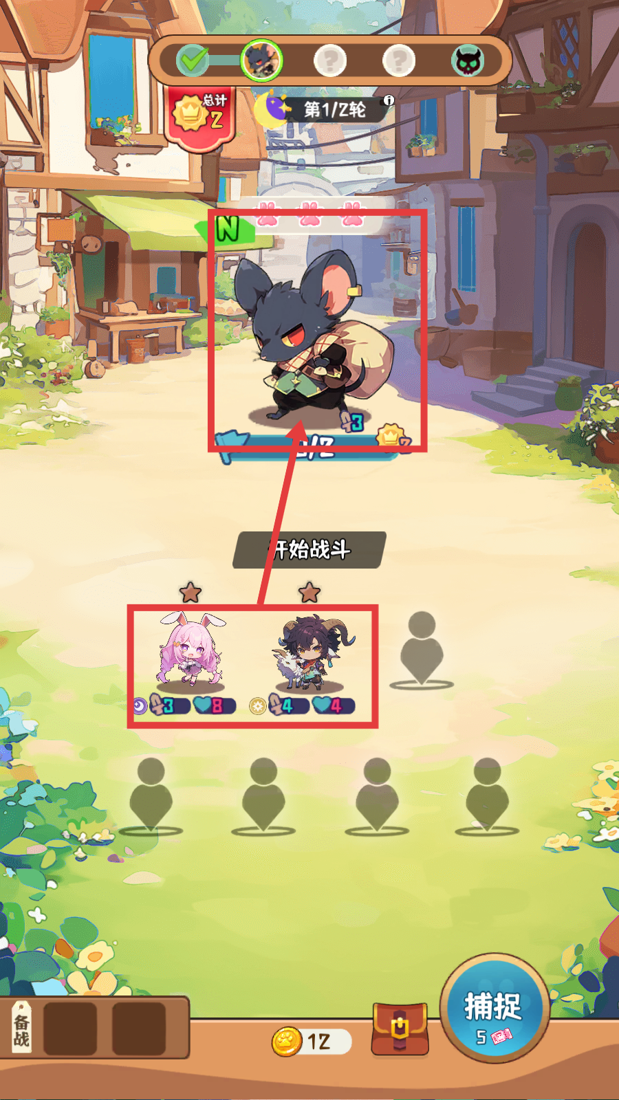3、进入战斗后,面对像老鼠这样的敌人,可先查看己方上阵角色的属性,再点击【开始战斗】,合理搭配角色应对。