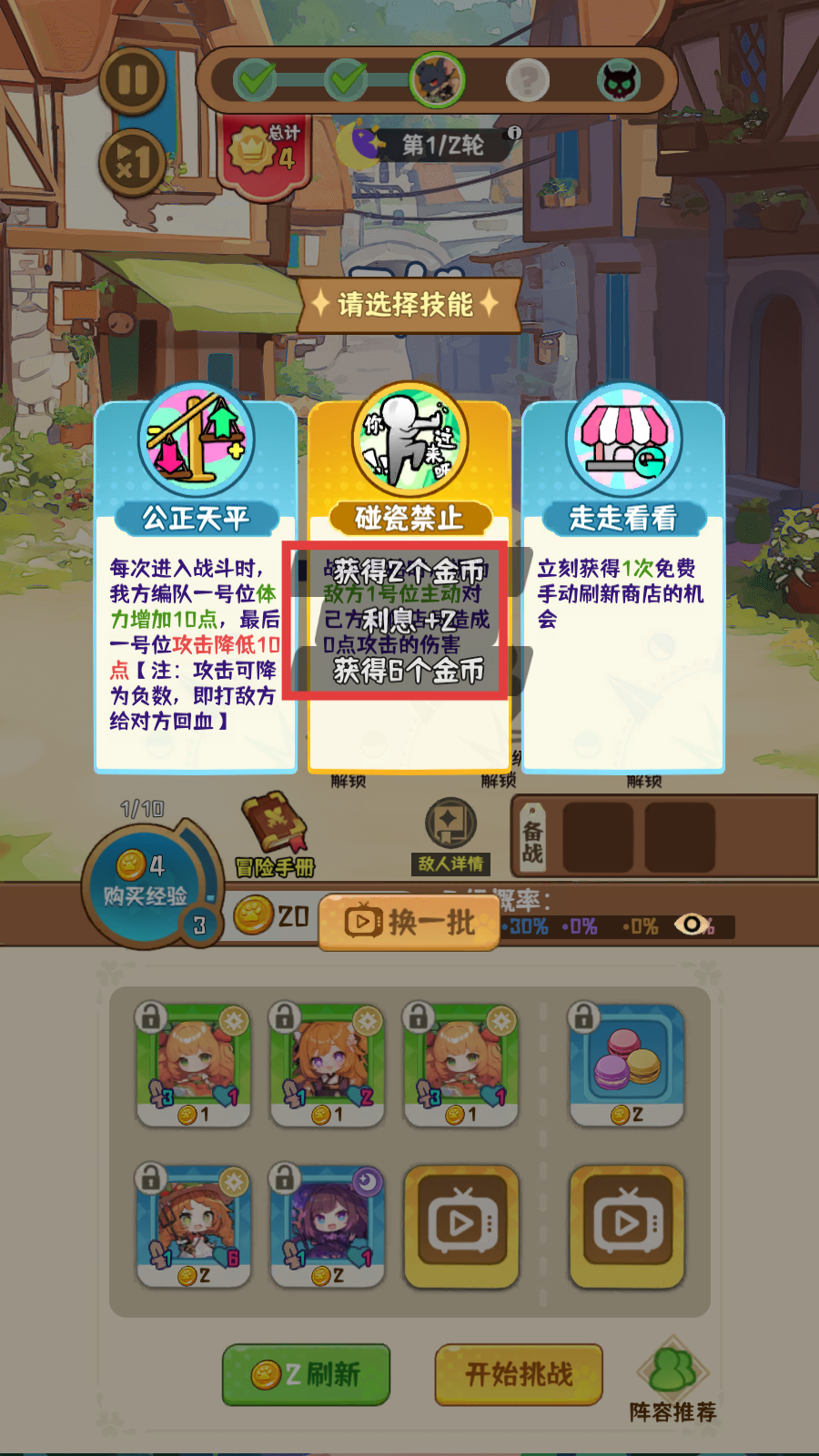 4、战斗间隙再次选技能时,若想拿金币就选【碰瓷禁止】,也可选【公正天平】调整一号位属性,或【走走看看】刷新商店。