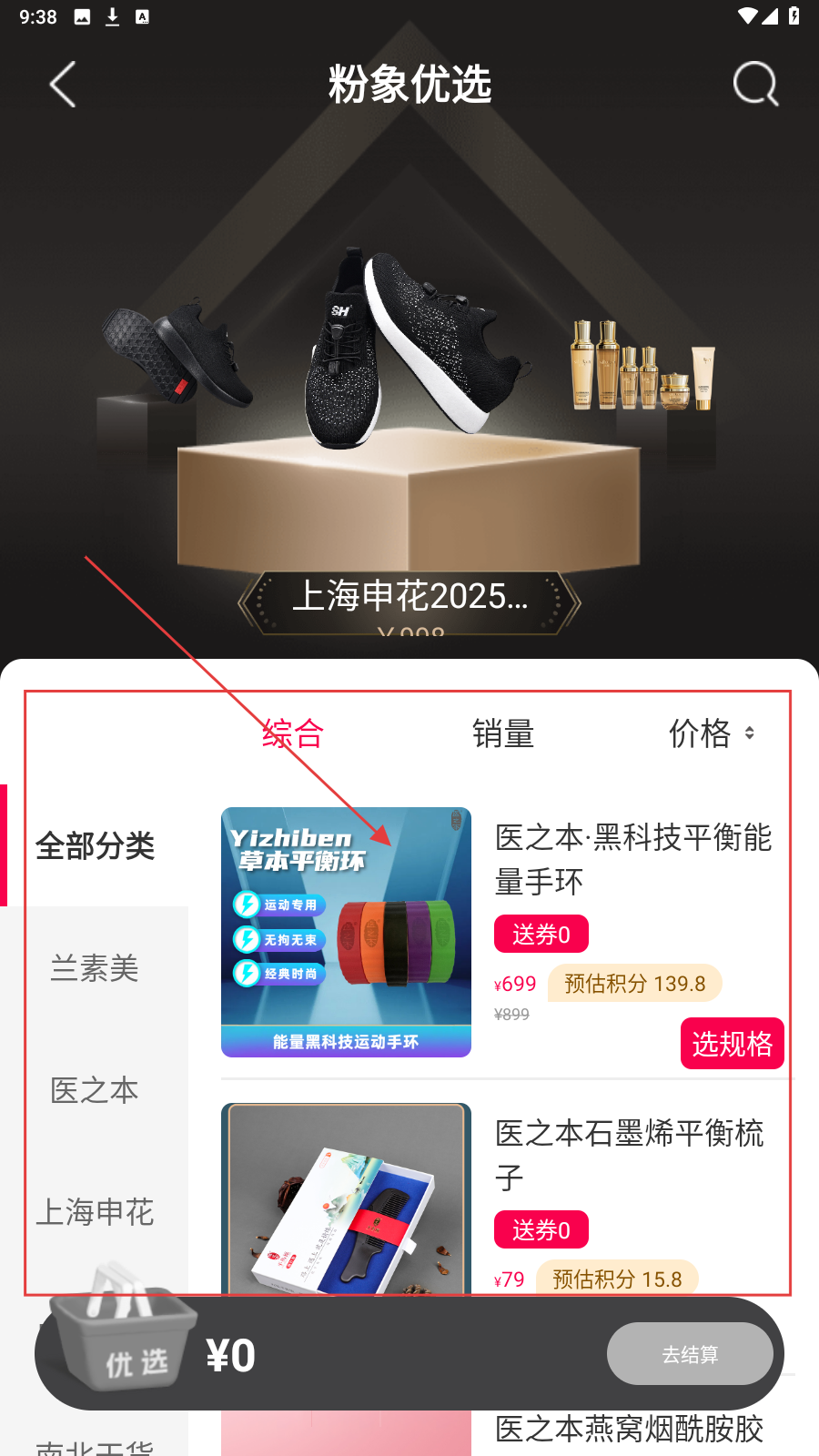 2、在【粉象优选】页,浏览“医之本”手环等商品,看价格与积分。