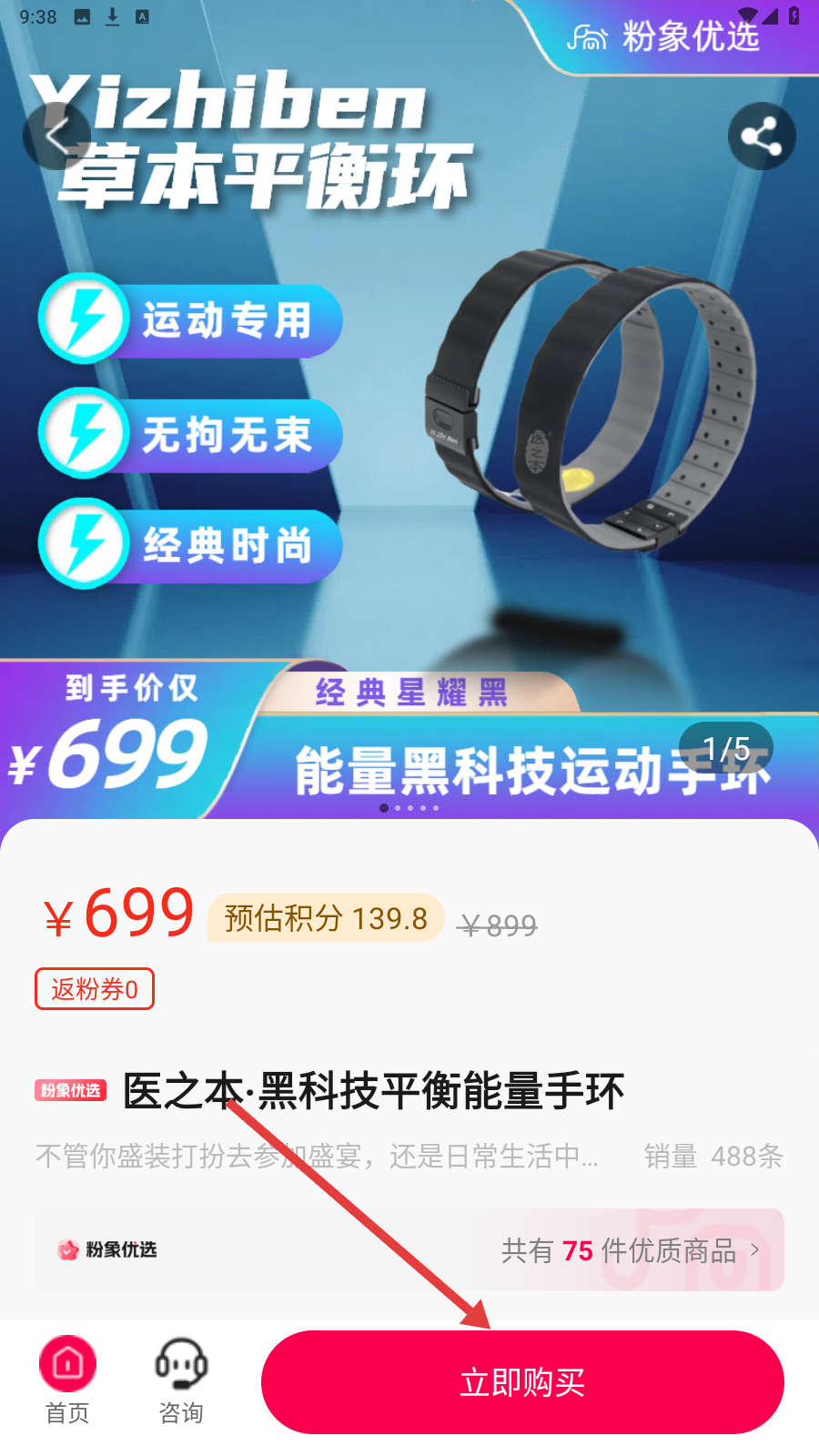 3、选中心仪商品,如“医之本黑科技平衡能量手环”,点【立即购买】下单。