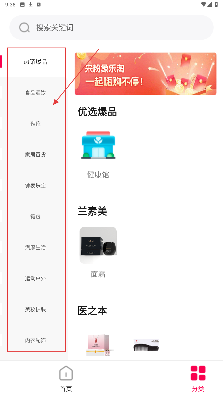 4、切换【分类】页,从食品酒饮、鞋靴等分类里,精准找想要的商品类型。