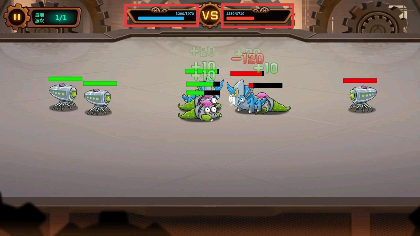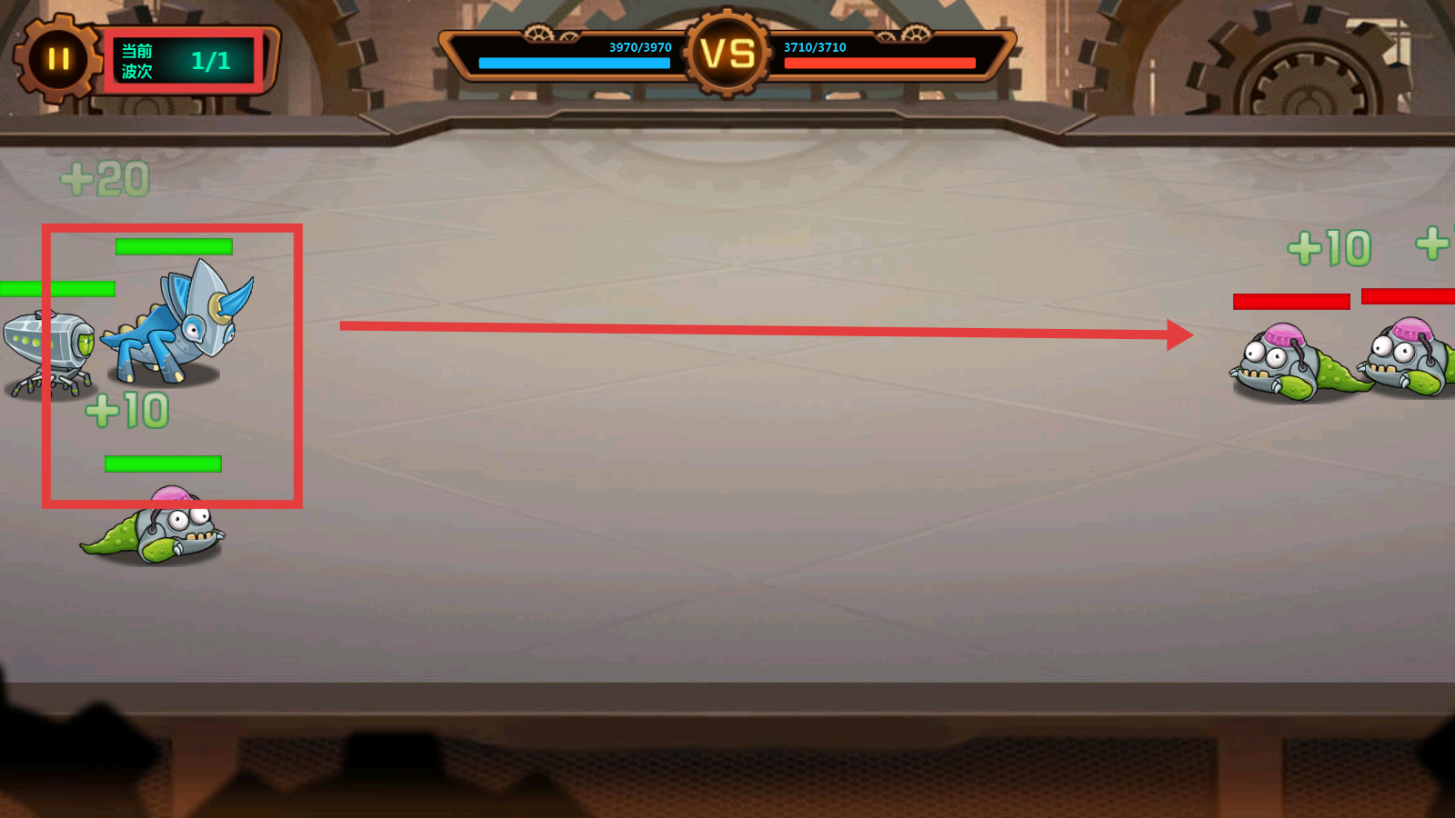 2、战斗时操控己方怪物向敌方发起进攻,借助战力优势逐步推进,注意当前波次-1/1的进度。