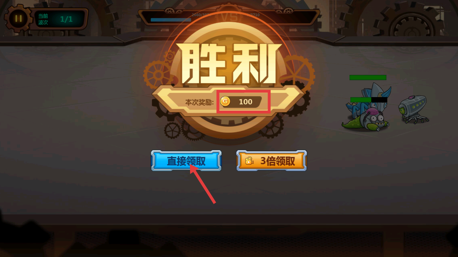 4、战斗胜利后,界面显示【胜利】,本次奖励100金币,点击【直接领取】即可获取奖励。