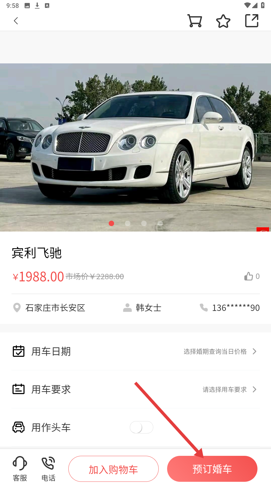 3、点进商品详情页,确认用车日期、要求,点击【预订婚车】完成下单。