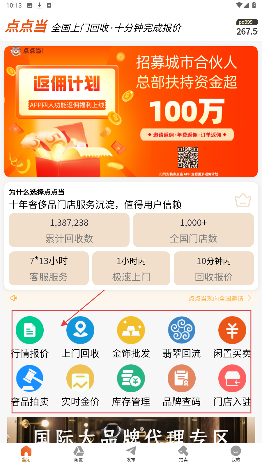1、进入【点点当】,先看【行情报价】了解奢侈品回收价,再选【上门回收】等服务,开启回收流程。
