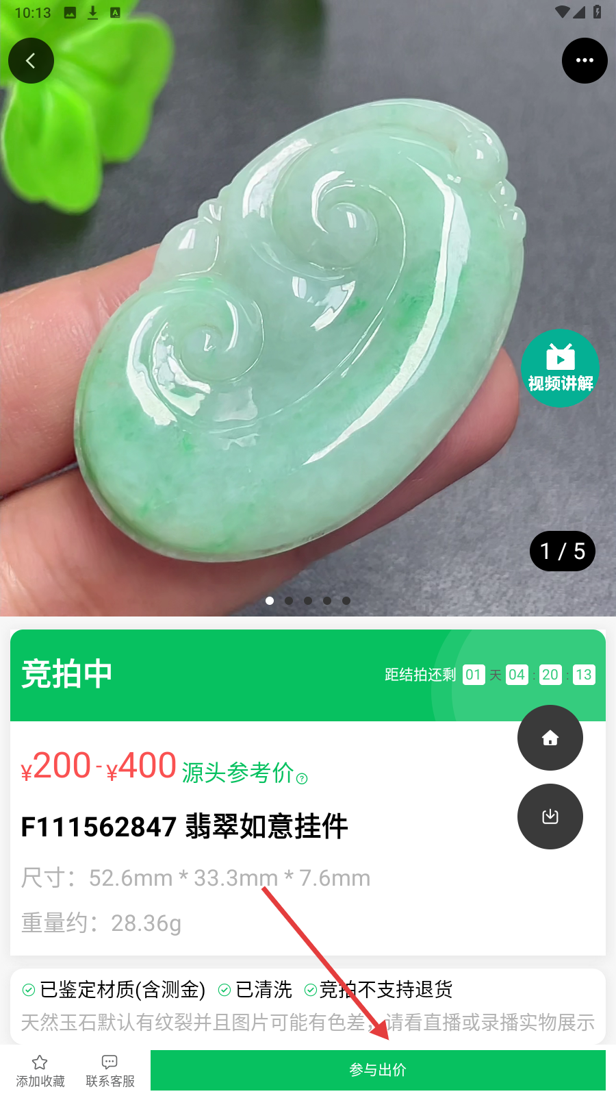 3、点进翡翠如意挂件详情,看尺寸、重量等信息,若想竞拍,点击【参与出价】参与。