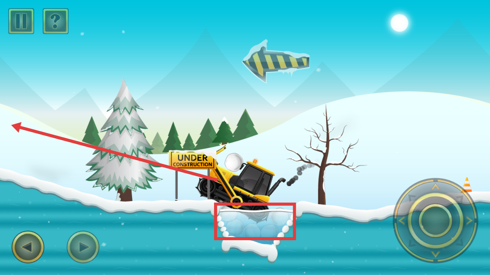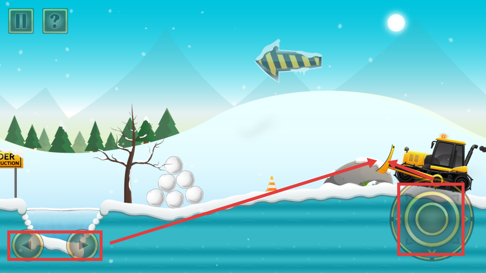 2、在挑战中,利用左侧方向键和右侧操作盘,操控黄色工程车移动,清理前方的雪球等障碍物。