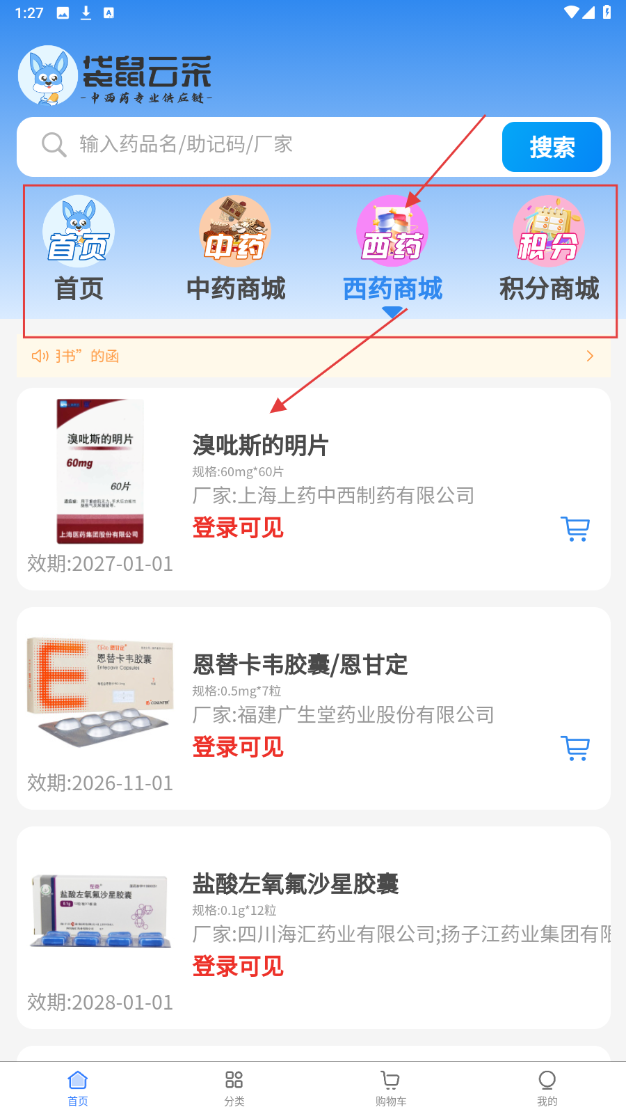 1、进入【袋鼠云采】平台,可在首页搜索药品,也能进入【中药商城】【西药商城】等分类进行查找药品。