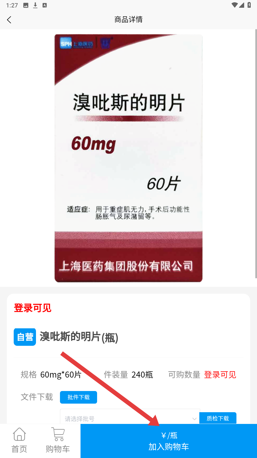 2、查看溴吡斯的明片商品详情,了解其适应症等,可以点击【加入购物车】。