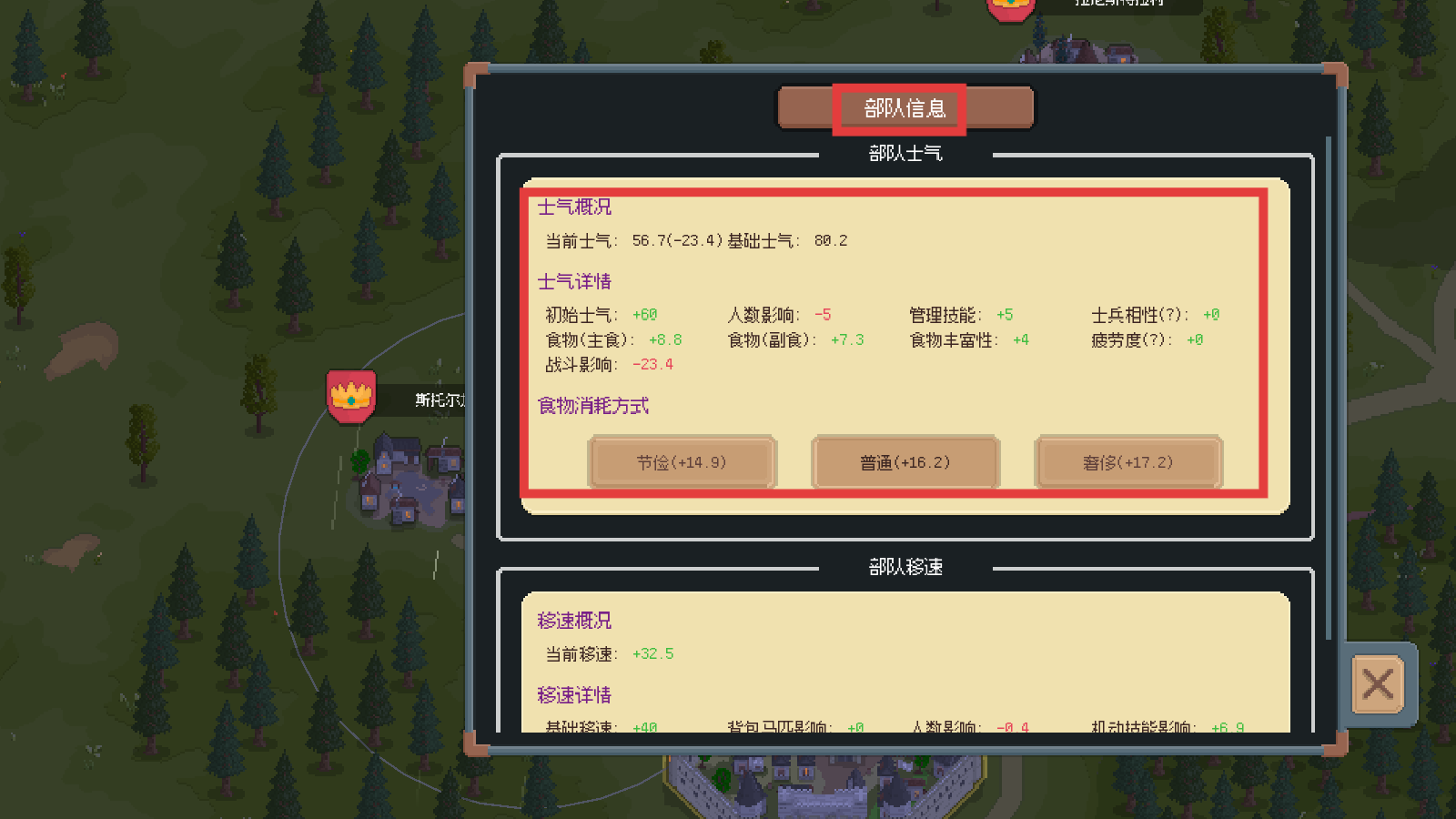 4、查看【部队信息】,关注士气概况与食物消耗方式,合理管理部队状态,保障冒险顺利。