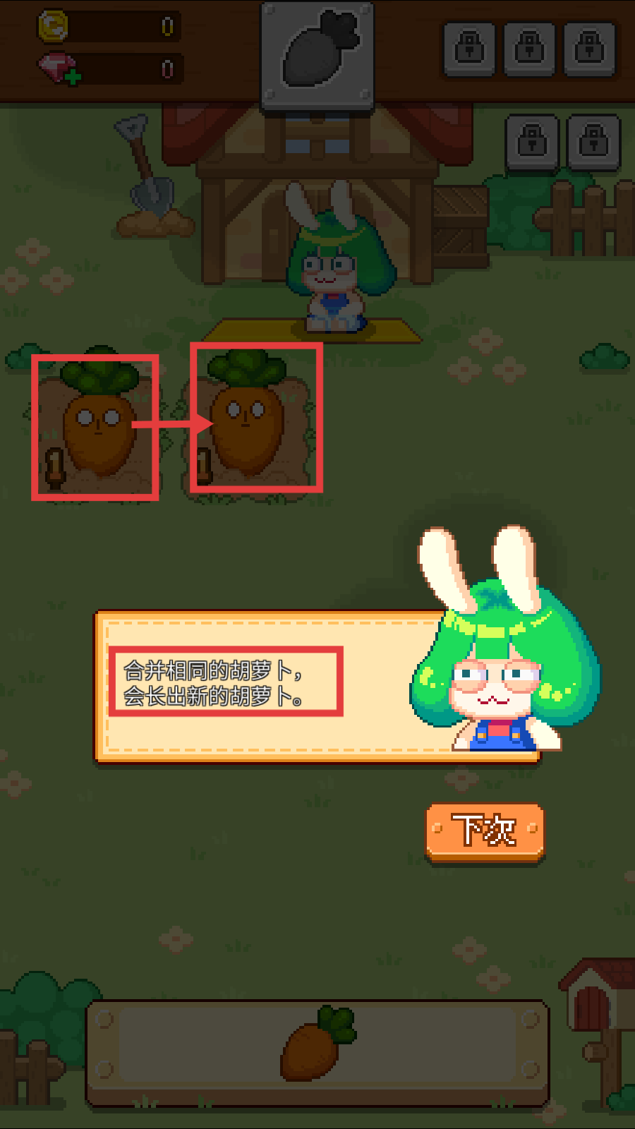 3、合并相同的胡萝卜,按照“合并相同的胡萝卜,会长出新的胡萝卜”的规则,培育更高级的胡萝卜。