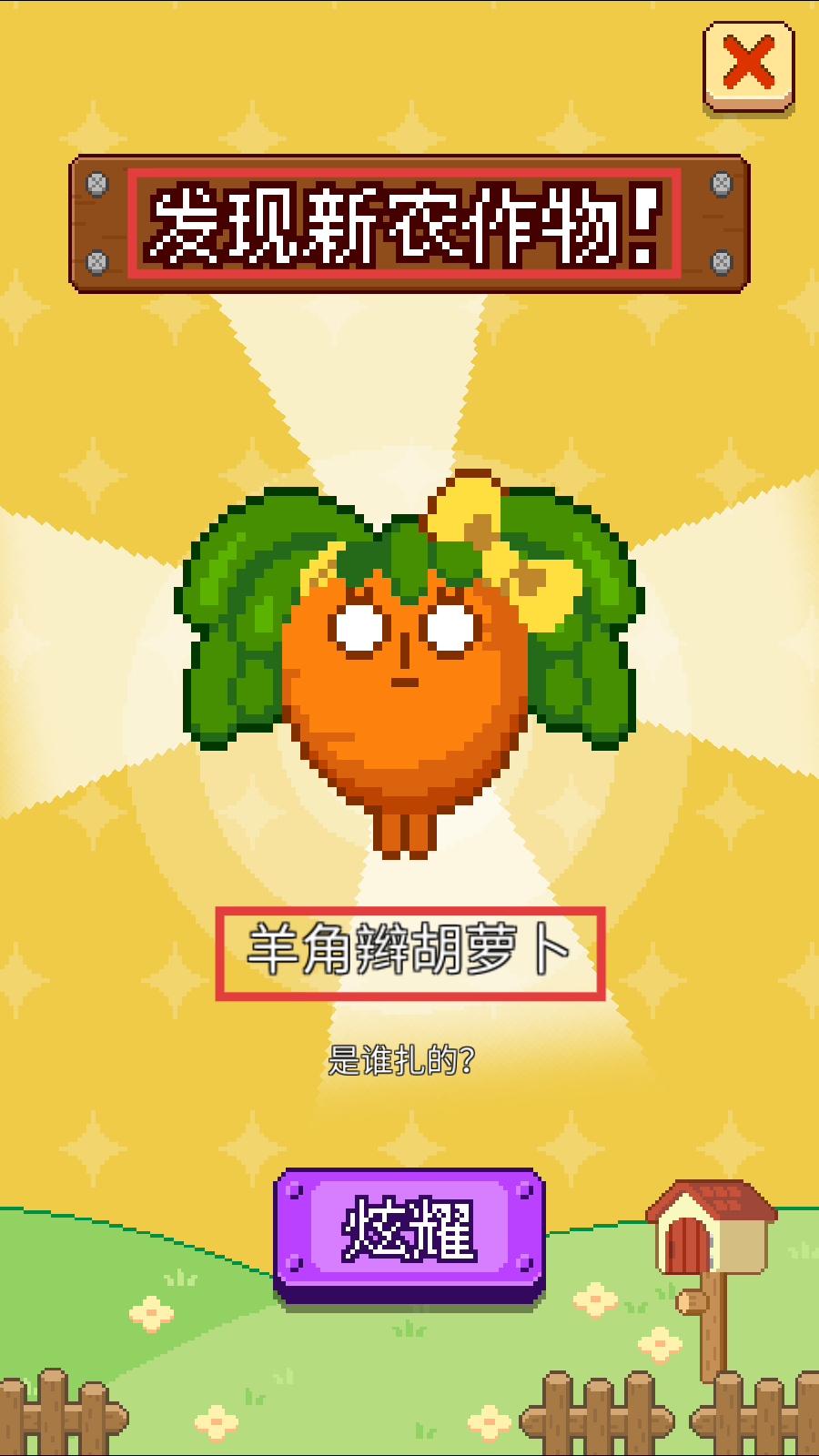 4、通过合并等操作,可发现新农作物,如“羊角辫胡萝卜”,解锁新的农场作物。