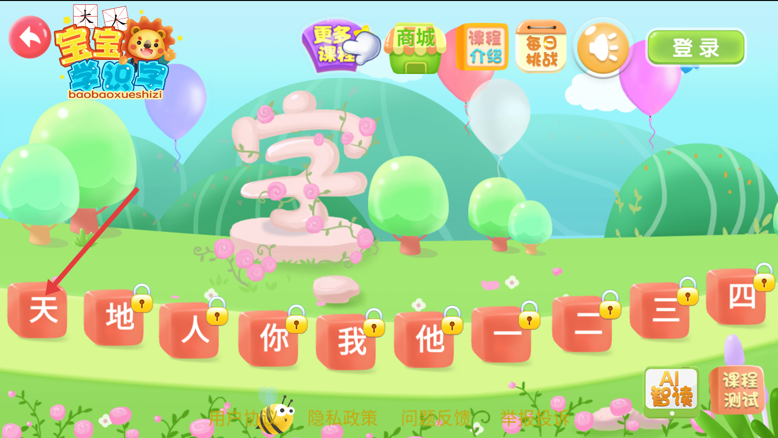 1、进入应用,界面有“天”“地”等汉字方块,选【天】字方块开启识字。