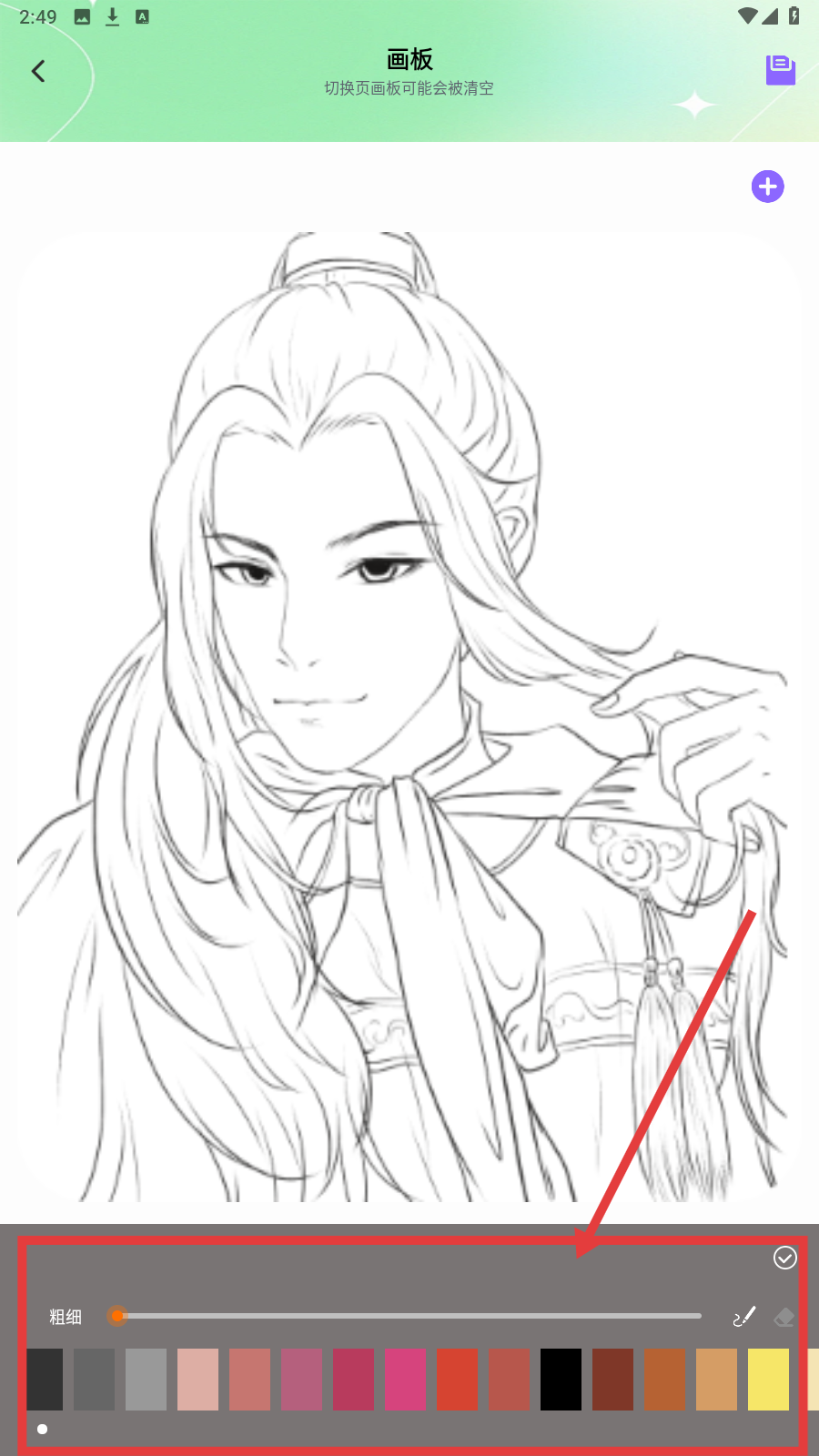 4、进入画板界面,可利用下方的粗细调节条和色彩选择栏,对画布上的线稿进行绘制创作。