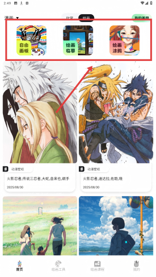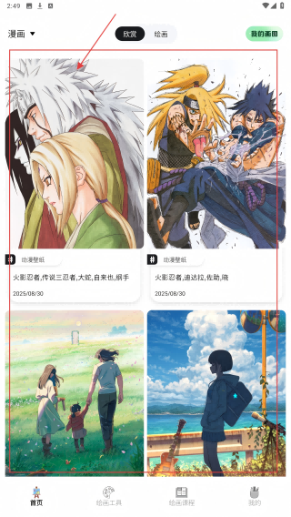 1、进入应用首页,浏览展示的动漫相关画作,挑选心仪的《火影忍者》主题画作。