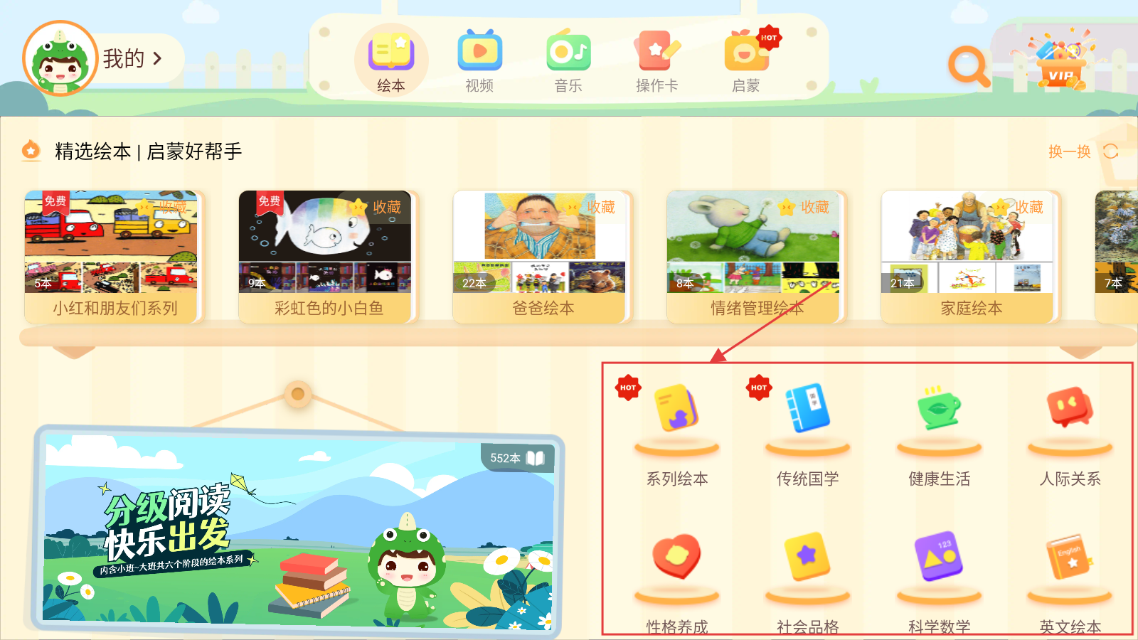 1、进入应用首页,能看到【系列绘本】【传统国学】等分类,可根据喜好选绘本分类。