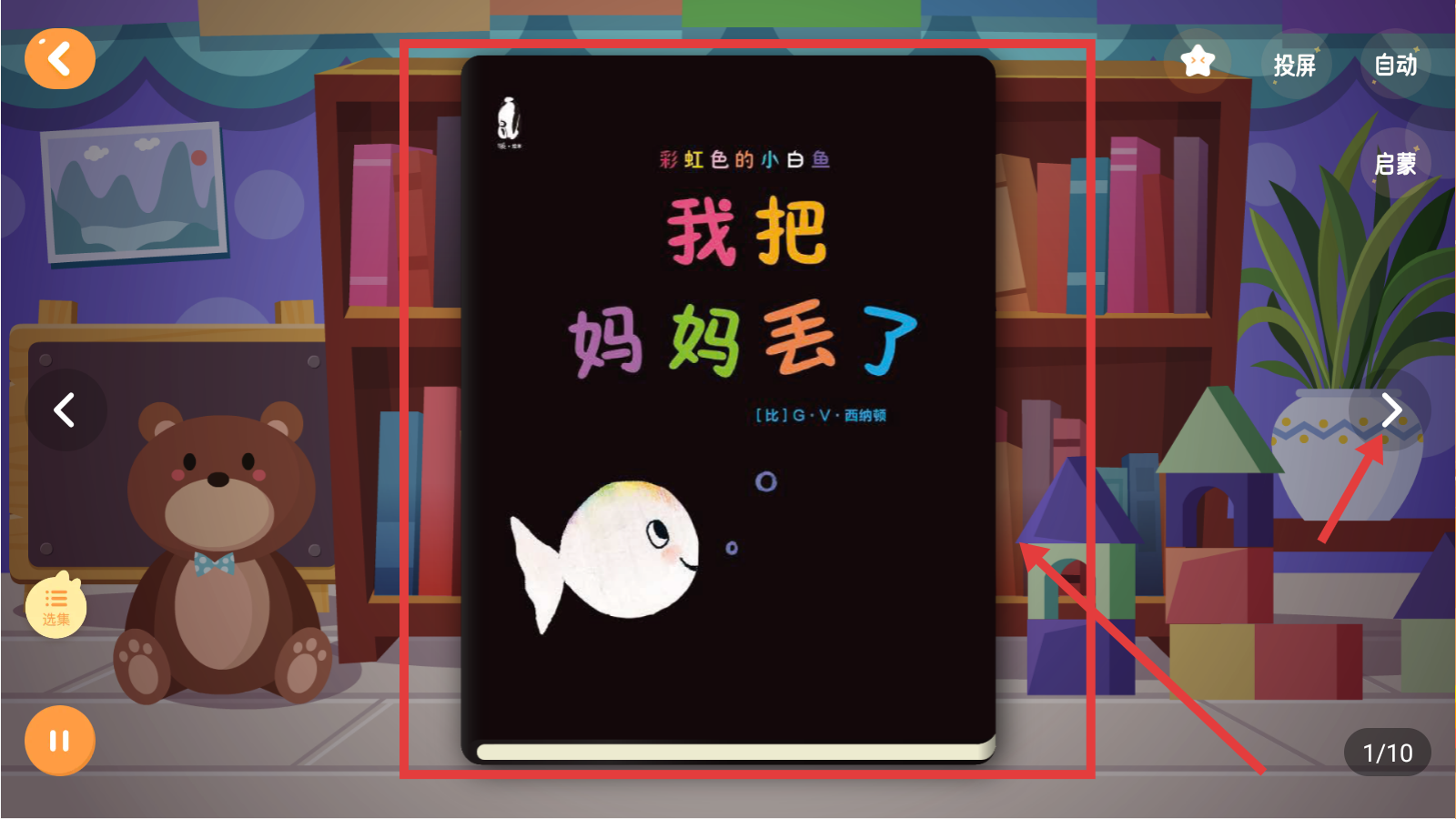 4、进入阅读界面,看到《彩虹色的小白鱼-我把妈妈丢了》封面,点右侧箭头可进行翻页阅读。